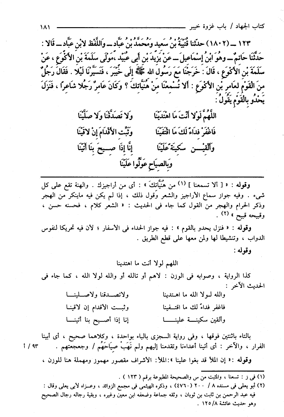123 - (1802) حدَّثنا قُتَيْبَةُ بْنُ سَعِيدٍ وَمُحَمَّدُ بْنُ عَبَّادٍ - وَاللَّفْظ لابْنِ عَبَّادٍ - قَالا: حَدَّثَنَا حَاتِمٌ - وهُوَ ابْنُ إِسْمَاعِيلَ - عَنْ يَزِيدَ بْنِ أَبِى عُبَيْدٍ، مَوْلَى سَلَمَةَ بْنِ الأَكْوَعِ، عَنْ سَلَمَةَ بْنِ الأَكْوَعِ، قَالَ: خَرَجْنَا مَعَ رَسُولِ اللهِ صَلَّى اللهُ عَلَيْهِ وَسَلَّمَ إِلَى خَيْبَرَ، فَتَسَيَّرْنَا لَيْلاً. فَقَالَ رَجُلٌ مِنَ الْقَوْمِ لِعَامِرِ بْنِ الأَكْوَعِ: أَلا تُسْمِعْنَا مِنْ هُنَيَّاتِكَ؟ وَكَانَ عَامِرٌ رَجُلاً شَاعِرًا، فَنَزَلَ يَحْدُو بِالْقَوْمِ يَقُولُ: