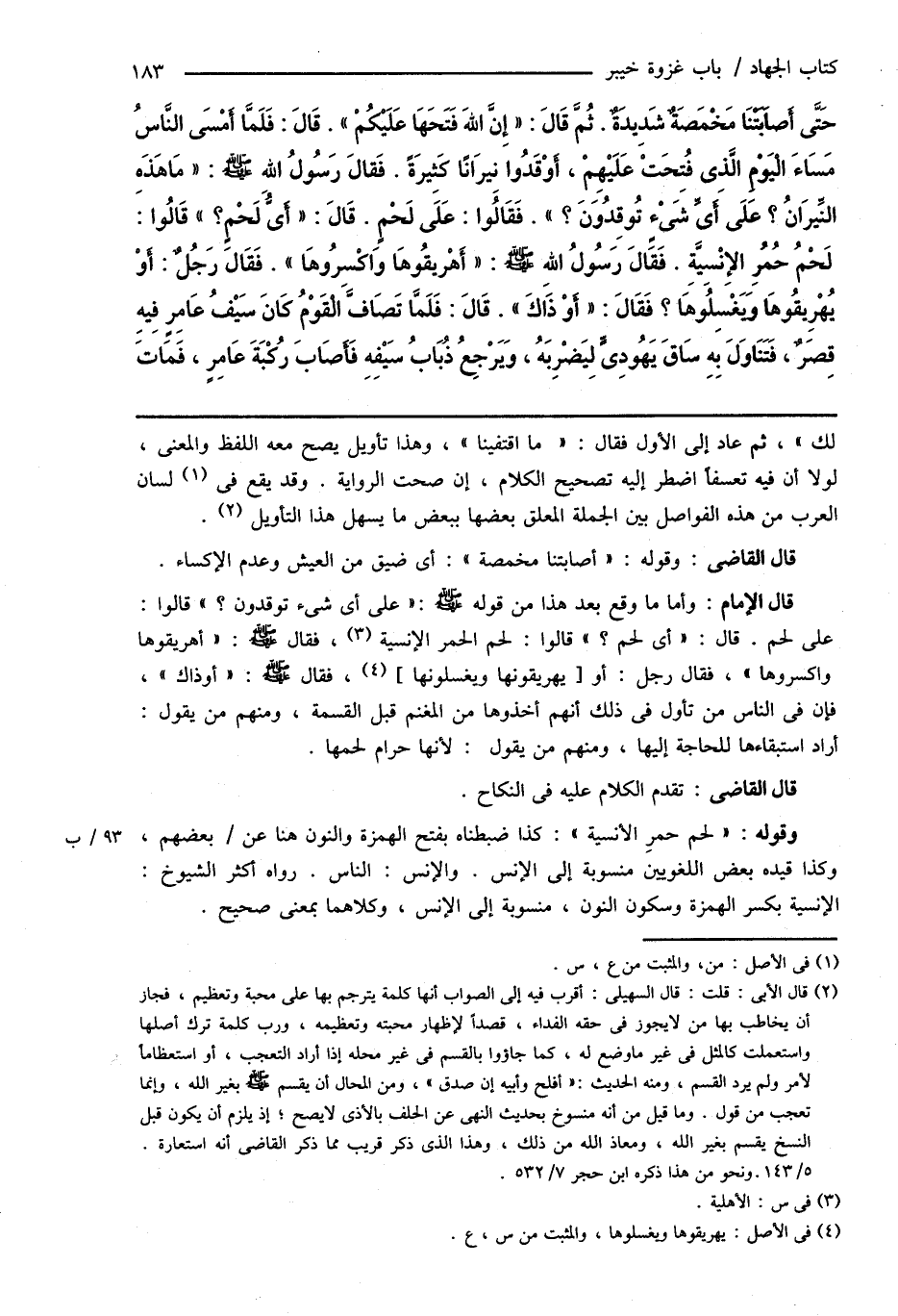 وقوله: " لحم حمرِ الأنسية ": كذا ضبطناه بفتح الهمزة والنون هنا عن بعضهم، وكذا قيده بعض اللغويين منسوبة إلى الإنس. والإنس: الناس. رواه أكثر الشيوخ: الإنسية بكسر الهمزة وسكون النون، منسوبة إلى الإنس، وكلاهما بمعنى صحيح.