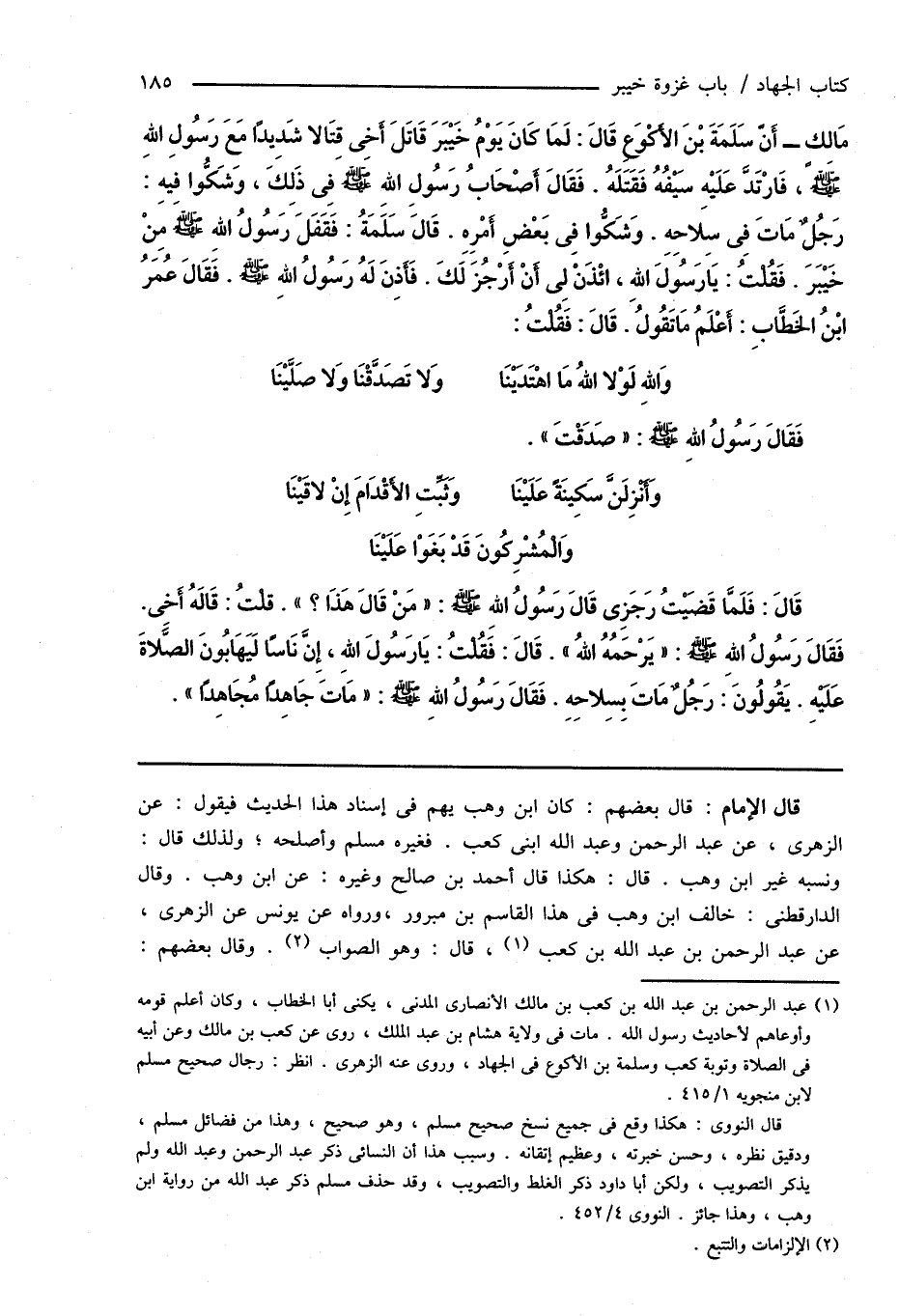 مَالِكٍ - أَنَّ سَلَمَةَ بْنَ الأَكْوَعِ قَالَ: لَمَا كَانَ يَوْمُ خَيْبَرَ قَاتَلَ أَخِى قِتَالاً شَدِيدًا مَعَ رَسُولِ اللهِ صَلَّى اللهُ عَلَيْهِ وَسَلَّمَ، فَارْتَدَّ عَلَيْهِ سَيْفُهُ فَقَتَلَهُ. فَقَالَ أَصْحَابُ رَسُولِ اللهِ صَلَّى اللهُ عَلَيْهِ وَسَلَّمَ فِى ذَلِكَ، وَشَكُّوا فِيهِ: رَجُلٌ مَاتَ فِى سِلاحِهِ. وَشَكُّوا فِى بَعْضِ أَمْرِهِ. قَالَ سَلَمَةُ: فَقَفَلَ رَسُولُ اللهِ صَلَّى اللهُ عَلَيْهِ وَسَلَّمَ مِنْ خَيْبَرَ. فَقُلْتُ: يَا رَسُولَ اللهِ، ائْذَنْ لِى أَنْ أَرْجُزَ لَكَ. فَأَذِنَ لَهُ رَسُولُ اللهِ صَلَّى اللهُ عَلَيْهِ وَسَلَّمَ. فَقَالَ عُمَرُ ابْنُ الخَطَّابِ: أَعْلَمُ مَا تَقُولُ. قَالَ: فَقُلْتُ: