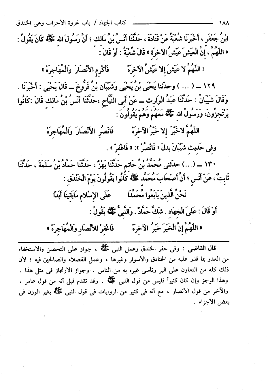 130 - (...) حدّثنى مُحَمَّدُ بْنُ حَاتِمٍ حَدَّثَنَا بَهْزٌ، حَدَّثَنَا حَمَّادُ بْنُ سَلَمَةَ، حَدَّثَنَا ثَابِثٌ، عَنْ أَنَسٍ؛ أَنَّ أَصْحَابَ مُحَمَّدٍ كَانُوا يَقُولُونَ يَوْمَ الخَنْدَقِ:
