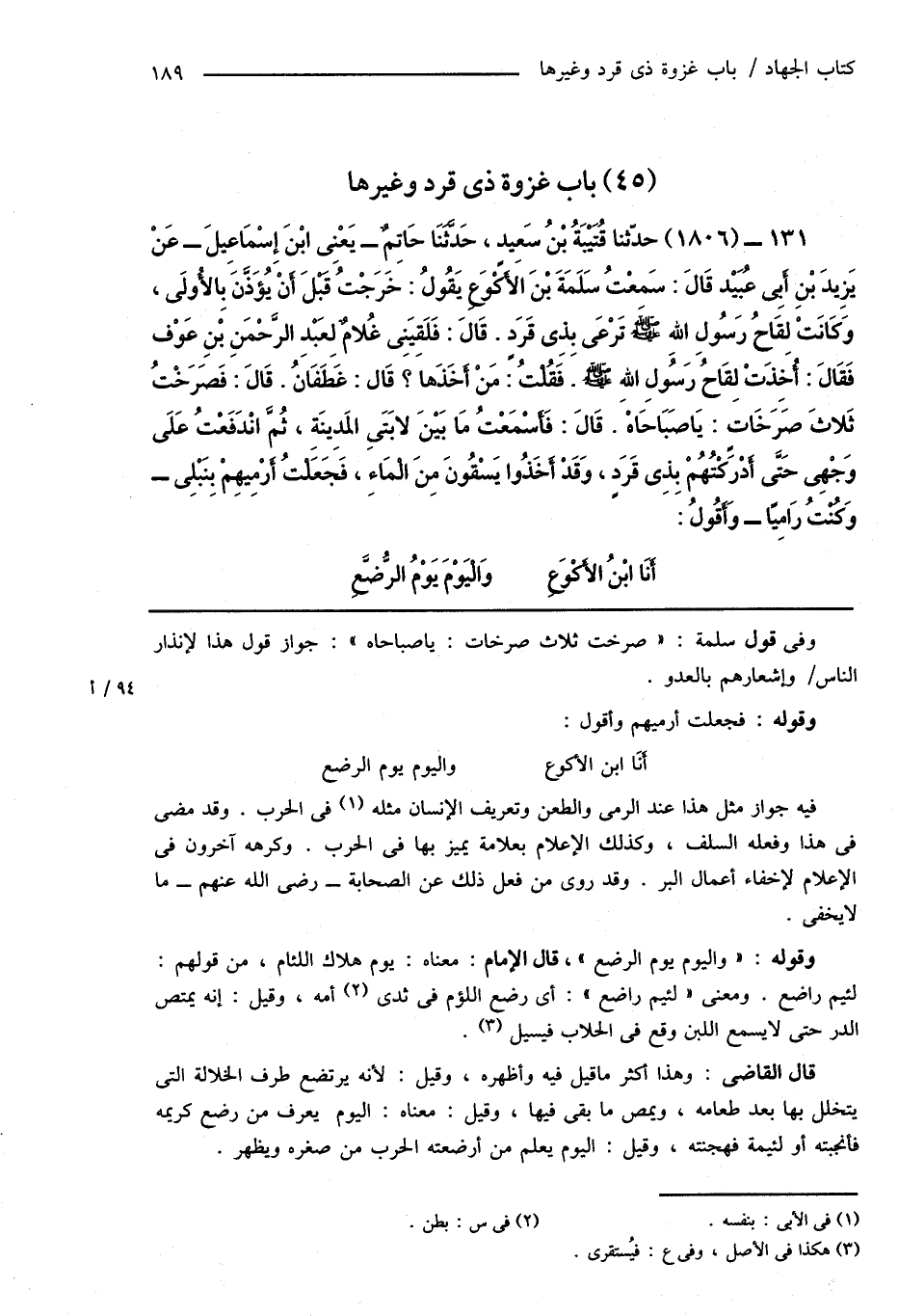131 - (1806) حدَّثنا قُتَيْبَةُ بْنُ سَعِيدٍ، حَدَّثَنَا حَاتِمٌ - يَعْنِى ابْنَ إِسْمَاعِيلَ - عَنْ يَزِيدَ بْنِ أَبِى عُبَيْد قَالَ: سَمِعْتُ سَلَمَةَ بْنَ الأَكْوَعِ يَقُولُ: خَرَجْتُ قَبْلَ أَنْ يُؤَذَّنَ بِالأُولَى، وَكَانَتْ لِقَاحُ رَسُولِ اللهِ صَلَّى اللهُ عَلَيْهِ وَسَلَّمَ تَرْعَى بِذِى قَرَدٍ. قَالَ: فَلَقِيَنِى غُلامٌ لِعَبْدِ الرَّحْمَنِ بْنِ عَوْف فَقَالَ: أُخِذَتْ لِقَاحُ رَسُولِ اللهِ صَلَّى اللهُ عَلَيْهِ وَسَلَّمَ. فَقُلْتُ: مَنْ أَخَذَها؟ قَال: غَطَفَانُ. قَالَ: فَصَرَخْتُ ثَلاثَ صَرَخَاتٍ: يَا صَبَاحَاهْ. قَالَ: فَأَسْمَعْتُ مَا بَيْنَ لابَتَىِ المَدِينَةِ، ثُمَّ انْدَفَعْتُ عَلَى وَجْهِى حَتَّى أَدْرَكْتُهُمْ بِذِى قَرَدٍ، وَقَدْ أَخَذُوا يَسْقُونَ مِنَ الْمَاءِ، فَجَعَلْتُ أَرْمِيهِمْ بِنَبْلِى - وَكُنْتُ رَامِيًا - وَأَقُولُ: