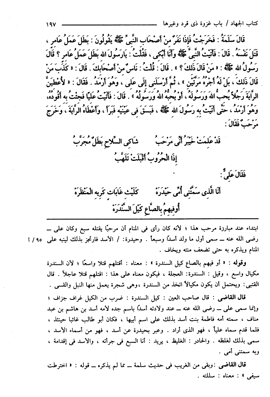 قال القاضى: قال صاحب العين: كيل السندرة: ضرب من الكيل غراف جزاف؛ وإنما سمى على - رضى الله عنه - عند ولادته أسدًا باسم جده لأمه أسد بن هاشم بن عبد مناف، سمته أمه فاطمة بنت أسد بذلك على اسم أبيها، فكان أبو طالب غائباً حينئذ، فلما قدم سماه علياً، فهو الذى أراد. وعبر بحيدرة عن أسد، فهو من أسماء الأسد، سمى بذلك لغلظه. والحادر: الغليظ، يريد: أنا السبع فى جرأته، والأسد فى إقدامة، وبه سمتنى أمى.