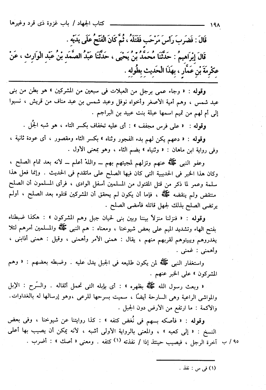 وعفو النبى صَلَّى اللهُ عَلَيْهِ وَسَلَّمَ عنهم ونزلهم لمجيئهم بهم - والله أعلم - لأنه بعد تمام الصلح، وكان هذا الخبر فى الحديبية التى كان فيها الصلح على ما تقدم فى الحديث. وإنما فعل هذا سلمة وعمر لما ذكر من قتل المقتول من المسلمين أسفل الوادى، فرأى المسلمون أن الصلح منتقض ولم ينقضه صَلَّى اللهُ عَلَيْهِ وَسَلَّمَ، فإما أن يكون لم يحقق أن المشركين قتلوه بعد الصلح، أولم يرتضى الصلح بذلك لجهل قاتله فأمضى الصلح.