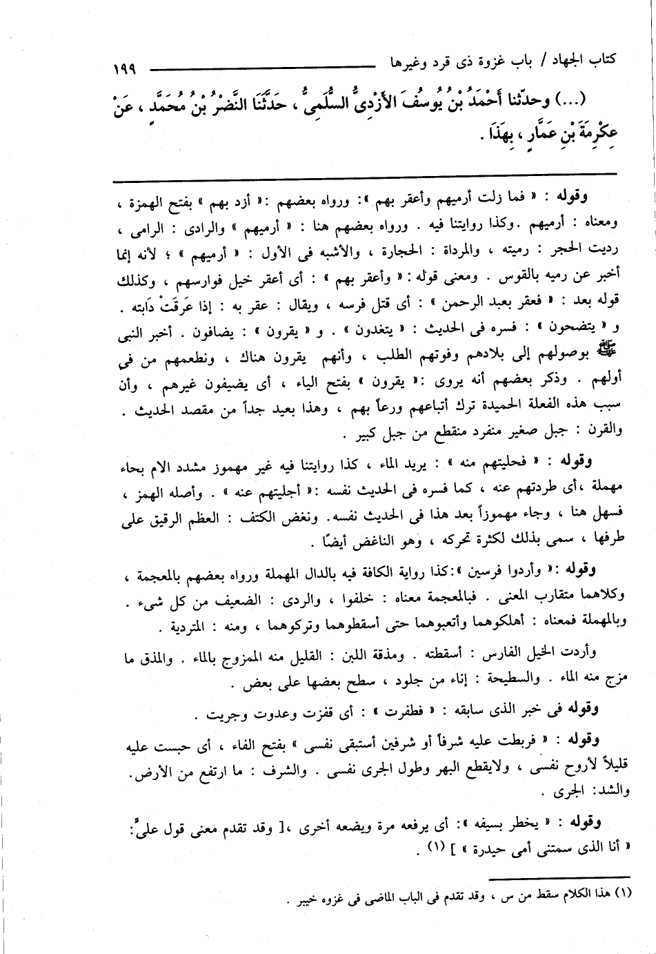 وقوله: " فما زلت أرميهم وأعقر بهم،: ورواه بعضهم: " أزد بهم " بفتح الهمزة، ومعناه: أرميهم. وكذا روايتنا فيه. ورواه بعضهم هنا: " أرميهم " والرادى: الرامى، رديت الحجر: رميته، والمرداة: الحجارة، والأشبه فى الأول: " أرميهم "؛ لأنه إنما أخبر عن رميه بالقوس. ومعنى قوله: " وأعقر بهم ": أى أعقر خيل فوارسهم، وكذلك قوله بعد: " فعقر بعبد الرحمن ": أى قتل فرسه، ويقال: عقر به: إذا عَرقَتْ دَابته. و" يتضحون ": فسره فى الحديث: " يتغدون ". و " يقرون ": يضافون. أخبر النبى صَلَّى اللهُ عَلَيْهِ وَسَلَّمَ بوصولهم إلى بلادهم وفوتهم الطلب، وأنهم يقرون هناك، ونطعمهم من فى أولهم. وذكر بعضهم أنه يروى: " يقرون " بفتح الياء، أى يضيفون غيرهم، وأن سبب هذه الفعلة الحميدة ترك أتباعهم ورعاً بهم، وهذا بعيد جداً من مقصد الحديث. والقرن: جبل صغير منفرد منقطع من جبل كبير.