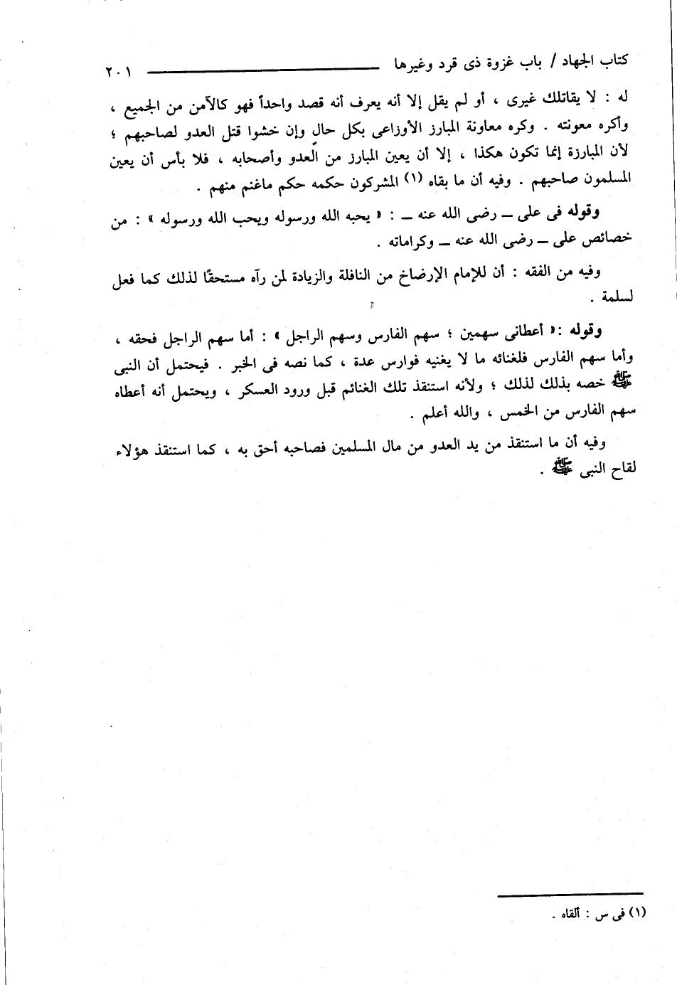 وقوله: " أعطانى سهمين؛ سهم الفارس وسهم الراجل ": أما سهم الراجل فحقه، وأما سهم الفارس فلغنائه ما لا يغنيه فوارس عدة، كما نصه فى الخبر. فيحتمل أن النبى صَلَّى اللهُ عَلَيْهِ وَسَلَّمَ خصه بذلك لذلك؛ ولأنه استنقذ تلك الغنائم قبل ورود العسكر، ويحتمل أنه أعطاه سهم الفارس من الخمس، والله أعلم.