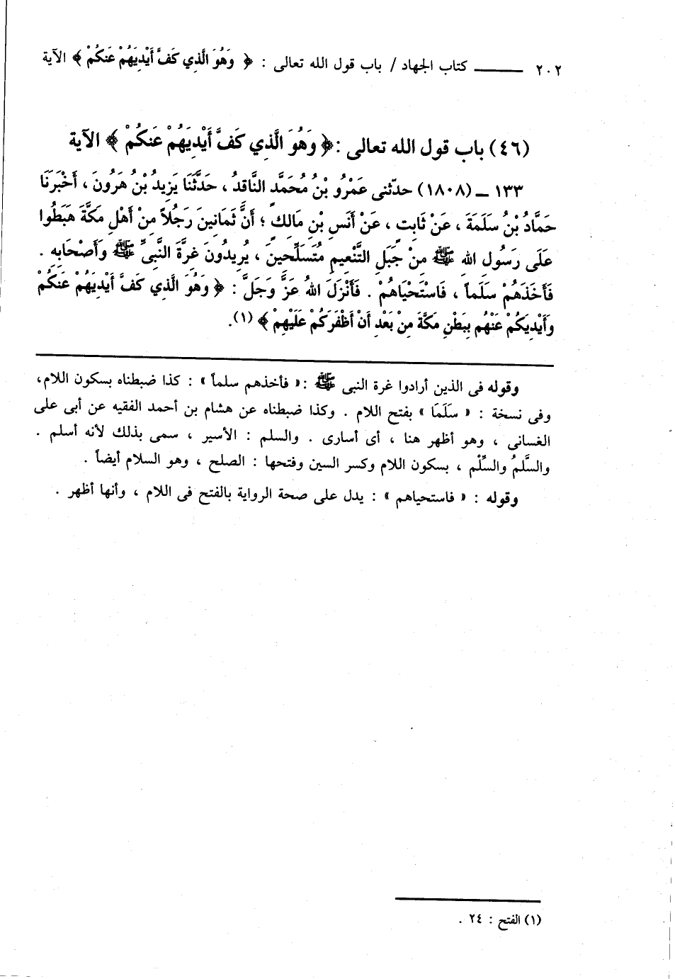 133 - (1808) حدّثنى عَمْرُو بْنُ مُحَمَّدٍ النَّاقِدُ، حَدَّثَنَا يَزِيدُ بْنُ هَارُونَ، أَخْبَرَنَا حَمَّادُ بْنُ سَلَمَةَ، عَنْ ثَابِتٍ، عَنْ أَنَسِ بْنِ مَالِكٍ؛ أَنَّ ثَمَانِينَ رَجُلاً مِنْ أَهْلِ مَكَّةَ هَبَطُوا عَلَى رَسُولِ اللهِ صَلَّى اللهُ عَلَيْهِ وَسَلَّمَ مِنْ جَبَلِ التَّنْعِيمِ مُتَسَلِّحِينَ، يُرِيدُونَ غِرَّةَ النَّبِىِّ صَلَّى اللهُ عَلَيْهِ وَسَلَّمَ وَأَصْحَابِهِ. فَأَخَذَهُمْ سَلَماً، فَاسْتَحْيَاهُمْ. فَأَنْزَلَ اللهُ عَزَّ وَجَلَّ: {وَهُوَ الَّذِي كَفَّ أَيْدِيَهُمْ عَنكُمْ وَأَيْدِيَكمْ عَنْهُم بِبَطْنِ مَكَّةَ مِنْ بَعْدِ أَنْ أَظْفَرَكُمْ عَلَيْهِمْ} (¬1).