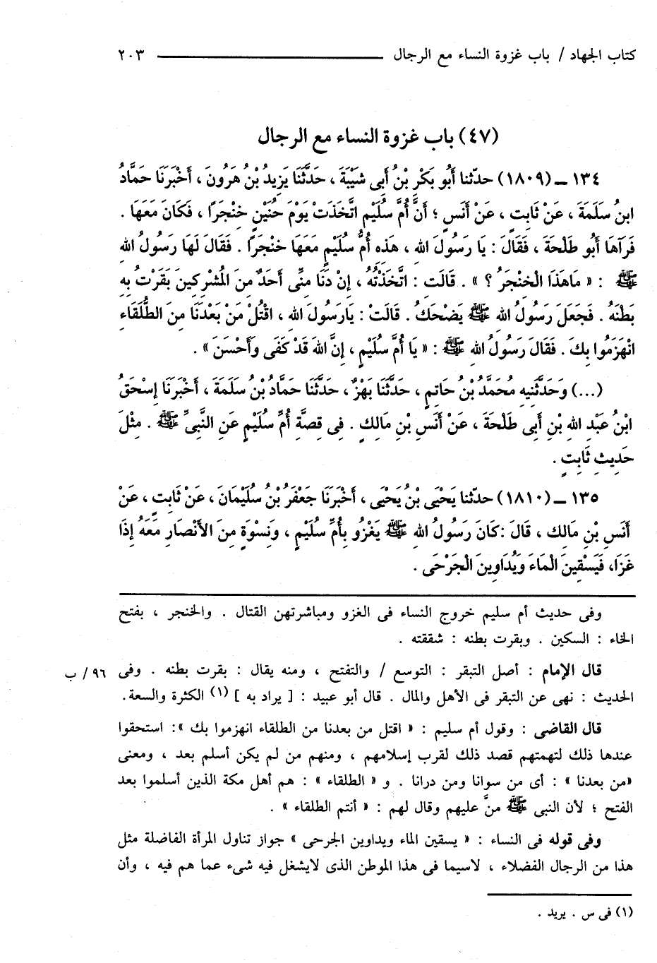 135 - (1810) حدَّثنا يَحْيَى بْنُ يَحْيَى، أَخْبَرَنَا جَعْفَرُ بْنُ سُلَيْمَانَ، عَنْ ثَابِتٍ، عَنْ أَنَسِ بْنِ مَالِك، قَالَ: كَانَ رَسُولُ اللهِ صَلَّى اللهُ عَلَيْهِ وَسَلَّمَ يَغْزُو بِأُمِّ سُلَيْمٍ، وَنِسْوَةٍ مِنَ الأَنْصَارِ مَعَهُ إِذَا غَزَا، فَيَسْقِينَ الْمَاءَ وُيدَاوِينَ الْجَرْحَى.