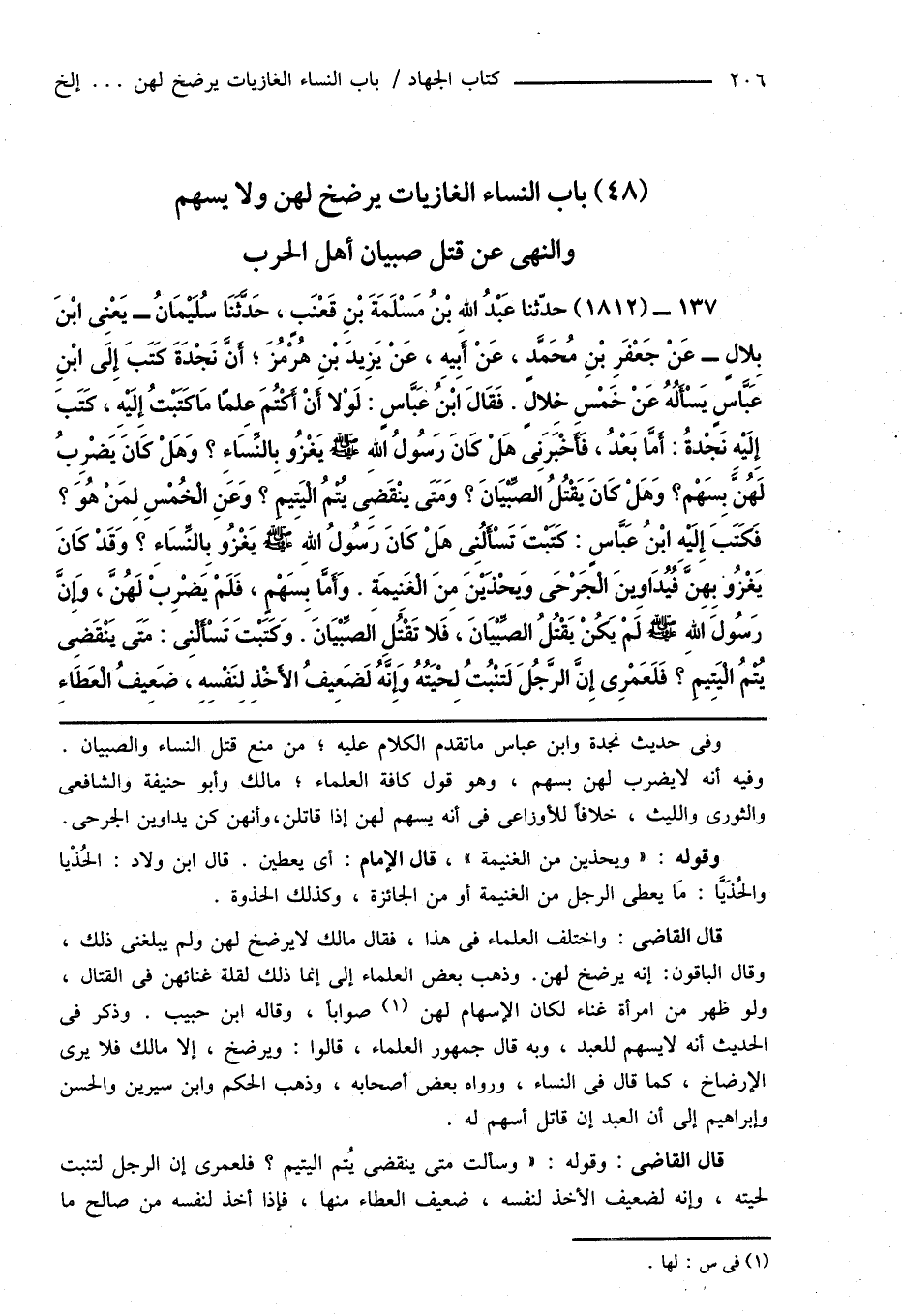 137 - (1812) حدَّثنا عَبْدُ اللهِ بْنُ مَسْلَمَةَ بْنِ قَعْنَبٍ، حَدَّثَنَا سُلَيْمَانُ - يَعْنِى ابْنَ بِلالٍ - عَنْ جَعْفَرِ بْنِ مُحَمَّدٍ، عَنْ أَبِيهِ، عَنْ يَزِيدَ بْنِ هُرمُزَ؛ أَنَّ نَجْدَةَ كَتَبَ إِلَى ابْنِ عَبَّاسٍ يَسْالُهُ عَنْ خَمْسِ خِلالٍ. فَقَالَ ابْنُ عَبَّاسٍ: لَوْلا أَنْ أَكْتُمَ عِلمًا مَا كَتَبْتُ إِلَيْهِ، كَتَبَ إِلَيْهِ نَجْدةُ: أَمَّا بَعْدُ، فَأَخْبَرَنِى هَلْ كَانَ رَسُولُ اللهِ صَلَّى اللهُ عَلَيْهِ وَسَلَّمَ يَغْزُو بِالنِّسَاءِ؟ وَهَلْ كَانَ يَضْرِبُ لَهُنَّ بِسَهْم؟ وَهَلْ كَانَ يَقْتُلُ الصِّبْيَانَ؟ وَمَتَى ينْقَضِى يُتْمُ الْيَتِيمَ؟ وَعَنِ الْخُمْسِ لِمَنْ هُوَ؟ فَكَتَبَ إِلَيْهِ ابْنُ عَبَّاسٍ: كَتَبْتَ تَسْأَلُنِى هَلْ كَانَ رَسُولُ اللهِ صَلَّى اللهُ عَلَيْهِ وَسَلَّمَ يَغْزُو بِالنِّسَاءِ؟ وَقَدْ كَانَ يَغْزُو بِهِنَّ فُيُدَاوِينَ الْجَرْحَى وَيحْذَيْنَ مِنَ الْغَنِيمَةِ. وَأَمَّا بِسَهْمٍ، فَلَمْ يَضْرِبْ لَهُنَّ، وَإِنَّ رَسُولَ اللهِ صَلَّى اللهُ عَلَيْهِ وَسَلَّمَ لَمْ يَكُنْ يَقْتُلُ الصِّبْيَانَ، فَلا تَقْتُلِ الصِّبْيَانَ. وَكَتَبْتَ تَسْأَلنِى: مَتَى يَنْقَضِى يُتْمُ الْيَتِيمَ؟ فَلَعَمْرِى إِنَّ الرَّجُلَ لَتنْبُتُ لِحْيَتُهُ وَإِنَّهُ لَضَعِيفُ الأَخْذِ لِنَفْسِهِ، ضَعِيفُ الْعَطَاءِ
