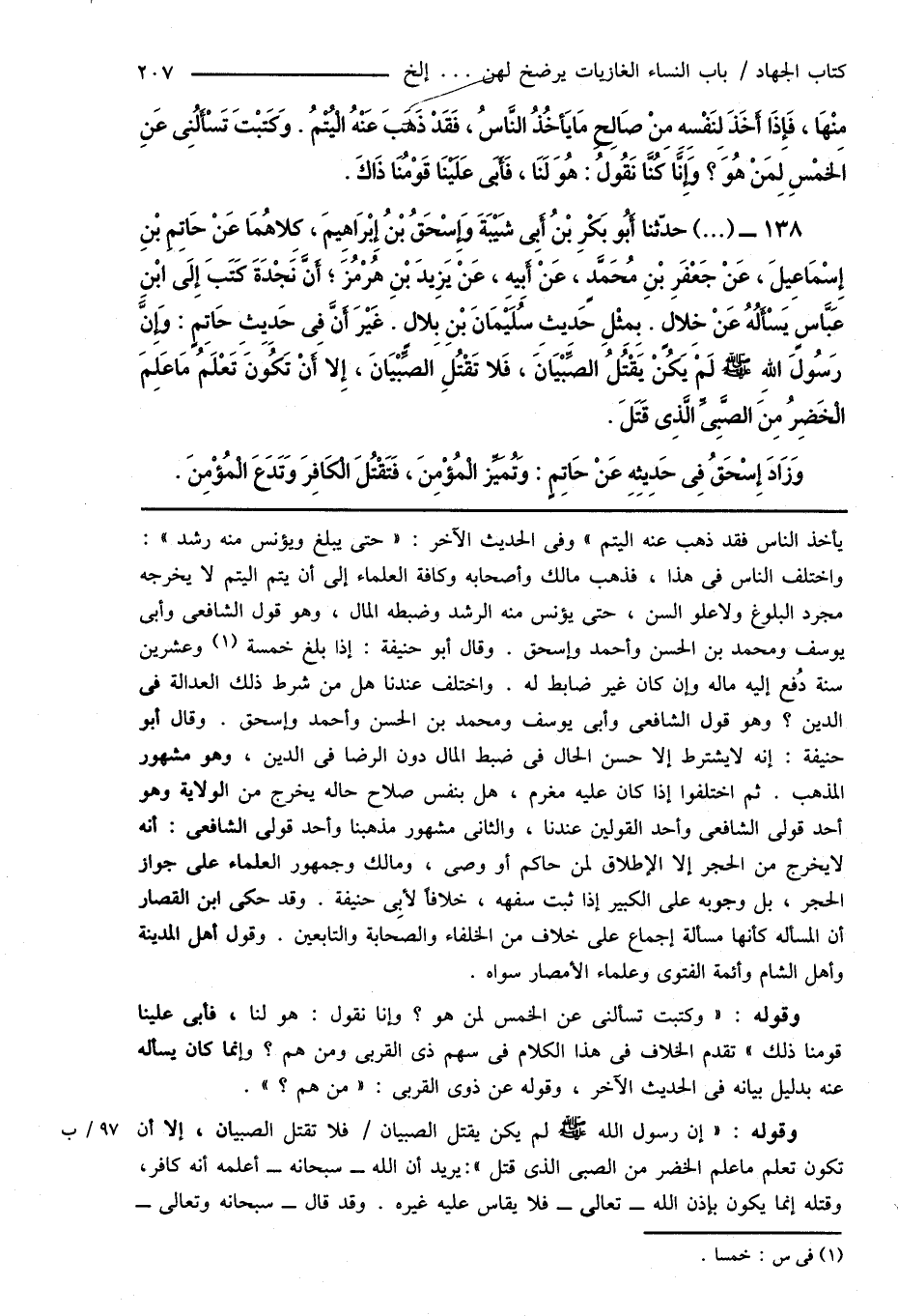 138 - (...) حدَّثنا أَبُو بَكْرِ بْنُ أَبِى شَيْبَةَ وَإِسْحَاقُ بْنُ إِبْرَاهِيمَ، كِلاهُمَا عَنْ حَاتِمِ بْنِ إِسْمَاعِيلَ، عَنْ جَعْفَرِ بْنِ مُحَمَّدٍ، عَنْ أَبِيهِ، عَنْ يَزِيدَ بْنِ هُرْمُزَ؛ أَنَّ نَجْدَةَ كَتَبَ إِلَى ابْنِ عَبَّاسٍ يَسْألُهُ عَنْ خِلالٍ. بِمِثْلِ حَدِيثِ سُلَيْمَانَ بْنِ بِلالٍ. غَيْرَ أَنَّ فِى حَدِيثِ حَاتِمٍ: وَإِنَّ رَسُولَ اللهِ صَلَّى اللهُ عَلَيْهِ وَسَلَّمَ لَمْ يَكُنْ يَقْتُلُ الصِّبْيَانَ، فَلا تَقْتُلِ الصِّبْيَانَ، إِلا أَنْ تَكُونَ تَعْلَمُ مَا عَلِمَ الْخَضِرُ مِنَ الصَّبِىِّ الَّذِى قَتَلَ.