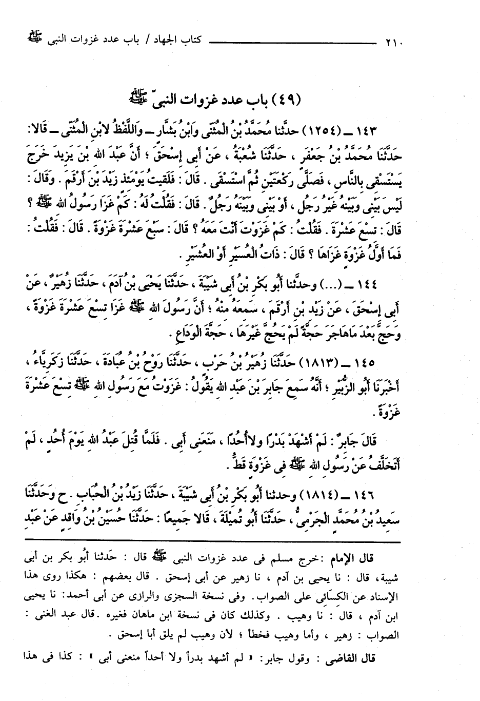 144 - (...) وحدَّثنا أَبُو بَكْرِ بْنُ أَبِى شَيْبَةَ، حَدَّثَنَا يَحْيَى بْنُ آدَمَ، حَدَّثَنَا زُهَيْرٌ، عَنْ أَبِى إِسْحَاقَ، عَنْ زَيْدِ بْنِ أَرْقَمَ، سَمِعَهُ مِنْهُ؛ أَنَّ رَسُولَ اللهِ صَلَّى اللهُ عَلَيْهِ وَسَلَّمَ غَزَا تِسْعَ عَشْرَةَ غَزْوَةَ، وَحَجَّ بَعْدَ مَا هَاجَرَ حَجَّةً لَمْ يَحُجَّ غَيْرَهَا، حَجَّةَ الْوَدَاعِ.