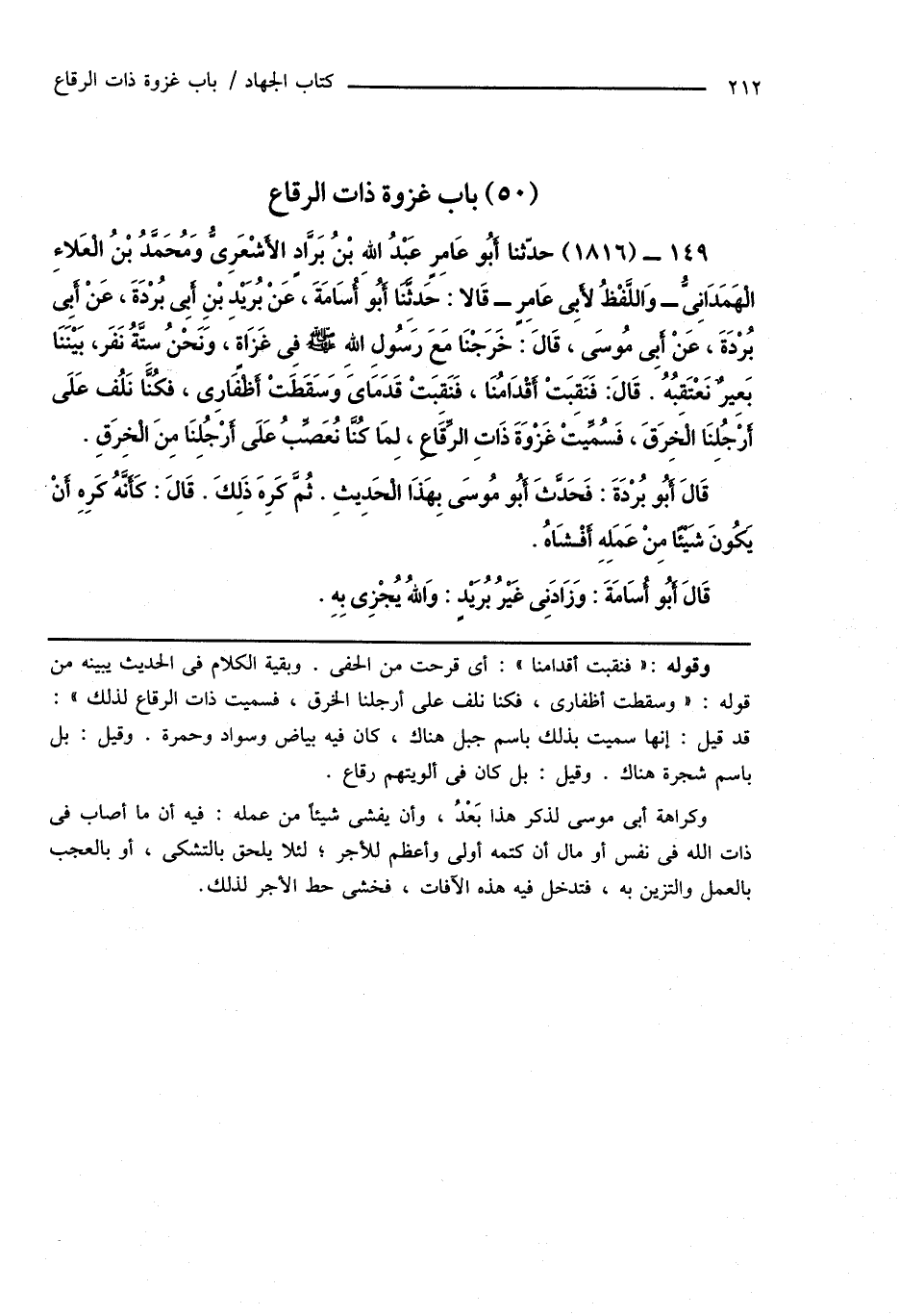 149 - (1816) حدَّثنا أَبُو عَامِرٍ عَبْدُ اللهِ بْنُ بَرَّادٍ الأَشْعَرِىُّ وَمُحَمَّدُ بْنُ الْعَلاءِ الْهَمَدَانِىُّ - وَاللَّفْظُ لأَبِى عَامِرٍ - قَالا: حَدَّثَنَا أَبُو أُسَامَةَ، عَنْ بُرَيْدِ بْنِ أَبِى بُرْدَةَ، عَنْ أَبِى بُرْدَةَ، عَنْ أَبِى مُوسَى، قَالَ: خَرَجْنَا مَعَ رَسُولِ اللهِ صَلَّى اللهُ عَلَيْهِ وَسَلَّمَ فِى غَزَاةٍ، وَنَحْنُ سِتَّةُ نَفَر، بَيْنَنَا بَعِيرٌ نَعْتَقبُهُ. قَالَ: فَنَقِبَتْ أَقْدَامُنَا، فَنَقِبَتْ قَدَمَاىَ وَسَقَطَتْ أَظْفَارِى، فَكُنَّا نَلُف عَلَى أَرْجُلِنَا الْخِرَقَ، فَسُمِّيتْ غَزْوَةَ ذَاتِ الرِّقَاعِ، لِمَا كُنَّا نُعَصِّبُ عَلَى أَرْجُلِنَا مِنَ الْخِرَقِ.