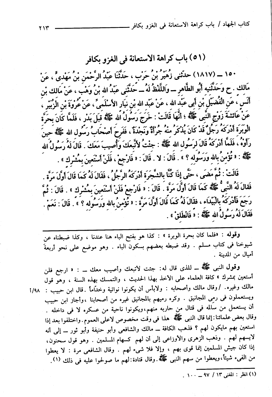 150 - (1817) حدّثنى زُهَيْرُ بْنُ حَرْبٍ، حَدَّثَنَا عَبْدُ الرَّحْمَنِ بْنُ مَهْدِىٍّ، عَنْ مَالِكٍ. ح وَحَدَّثَنِيهِ أَبُو الطَّاهِرِ - وَاللَّفْظُ لَهُ - حَدَّثَنِى عَبْدُ اللهِ بْنُ وَهْبٍ، عَنْ مَالِك بْنِ أَنَسٍ، عَنِ الْفُضَيْلِ بْنِ أَبِى عَبْدِ اللهِ، عَنْ عَبْدِ اللهِ بْنِ نِيَارٍ الأَسْلَمَىِّ، عَنْ عُرْوَةَ بْنِ الْزُّبَيْرِ، عَنْ عَائِشَةَ زَوْجِ النَّبِىِّ صَلَّى اللهُ عَلَيْهِ وَسَلَّمَ؛ أَنَّهَا قَالَتْ: خَرَجَ رَسُولُ اللهِ صَلَّى اللهُ عَلَيْهِ وَسَلَّمَ قِبَلَ بَدْرٍ، فَلَمَّا كَانَ بِحَرَّةِ الْوَبَرَةِ أَدْرَكَهُ رَجُلٌ قَدْ كَانَ يُذْكَرُ مِنْهُ جُرْأَةٌ وَنَجْدَةٌ، فَفَرِحَ أَصْحَابُ رَسُولِ اللهِ صَلَّى اللهُ عَلَيْهِ وَسَلَّمَ حِينَ رَأَوْهُ، فَلَمَّا أَدْرَكَهُ قَالَ لِرَسُولِ اللهِ صَلَّى اللهُ عَلَيْهِ وَسَلَّمَ: جِئْتُ لأَتَّبِعَكَ وَأُصِيبَ مَعَكَ. قَالَ لَهُ رَسُولُ اللهِ صَلَّى اللهُ عَلَيْهِ وَسَلَّمَ: " تُؤْمِنُ بِاللهِ وَرَسُولِهِ؟ ". قَالَ: لا. قَالَ: " فَارْجِعْ، فَلَنْ أَسْتَعِينَ بِمُشْرِكٍ ". قَالَتْ: ثُمَّ مَضَى، حَتَّى إذَا كُنَّا بِالشَّجَرَةِ أَدْرَكَهُ الرَّجُلُ، فَقَالَ لَهُ كَمَا قَالَ أَوَّلَ مَرَّة.