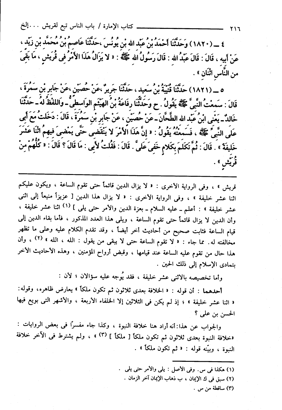 4 - (1820) وَحَدَّثَنَا أَحْمَدُ بْنُ عَبْدِ اللهِ بْنِ يُونُسَ، حَدَّثَنَا عَاصِمُ بْنُ مُحَمَّدِ بْنِ زَيْدٍ، عَنْ أَبِيهِ، قَالَ: قَالَ عَبْدُ اللهِ: قَالَ رَسُولُ اللهِ صَلَّى اللهُ عَلَيْهِ وَسَلَّمَ: " لا يَزَالُ هَذَا الأَمْرُ فِى قُرَيشٍ، مَا بَقِىَ من النَّاسِ اثْنَانِ ".