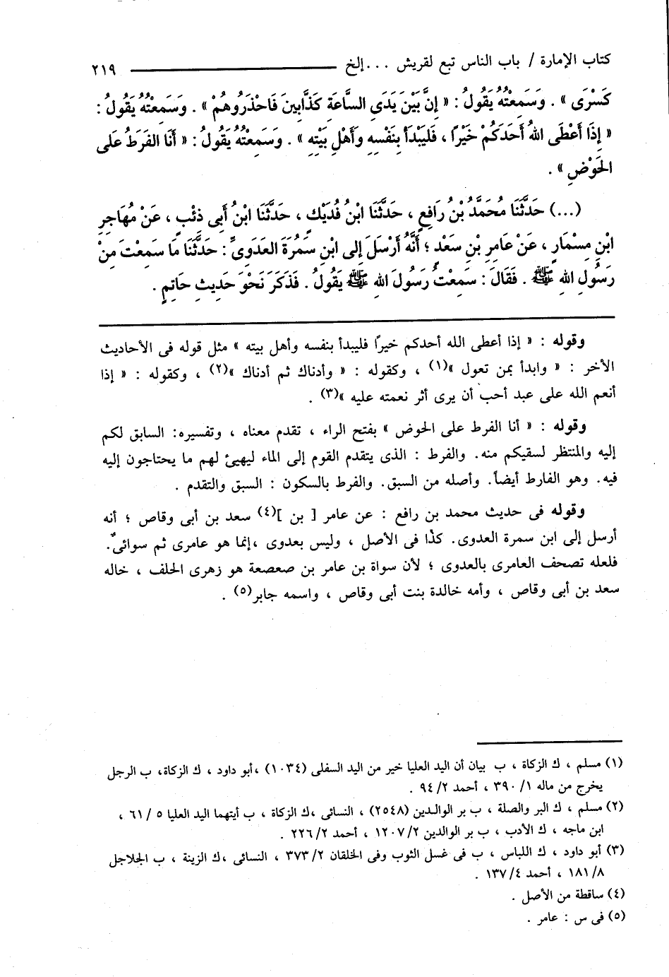 (...) حَدَّثَنَا مُحَمَّدُ بْنُ رَافِعٍ، حَدَّثَنَا ابْنُ فُدَيْكٍ، حَدَّثَنَا ابْنُ أَبِى ذِئْبٍ، عَنْ مهَاجِرِ ابْنِ مِسْمَارٍ، عَنْ عَامِرِ بْنِ سَعْدٍ؛ أَنَّهُ أَرْسَلَ إِلَى ابْنِ سَمُرَةَ العَدَوِىِّ: حَدِّثْنَا مَا سَمِعْتَ مِنْ رَسُولَ اللهِ صَلَّى اللهُ عَلَيْهِ وَسَلَّمَ. فَقَالَ: سَمِعْتُ رَسُولَ اللهِ صَلَّى اللهُ عَلَيْهِ وَسَلَّمَ يَقُولُ. فَذَكَرَ نَحْوَ حَدِيثِ حَاتِمٍ.
