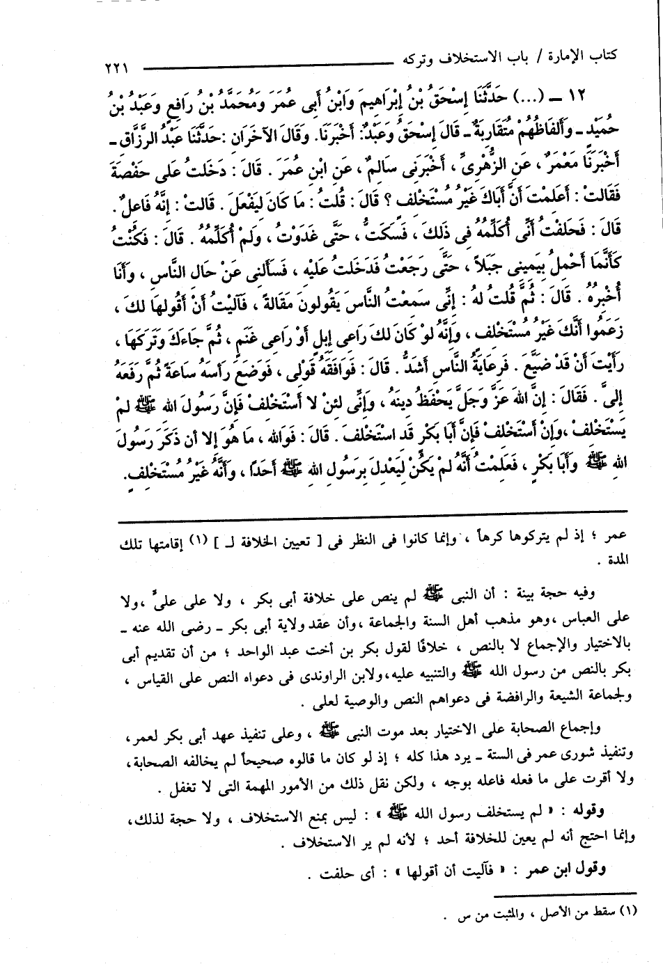 12 - (...) حَدَّثَنَا إِسْحَاقُ بْنُ إِبْرَاهِيمَ وَابْنُ أَبِى عُمَرَ وَمُحَمَّدُ بْنُ رَافِعٍ وَعَبْدُ بْنُ حُمَيْدٍ - وَأَلفَاظُهُمْ مُتَقَارِبَةٌ - قَالَ إِسْحَاقُ وَعَبْدٌ: أَخْبَرَنَا. وَقَالَ الآخَرَانِ: حَدَّثَنَا عَبْدُ الرَّزَّاقِ - أَخْبَرَنَا مَعْمَرٌ، عَنِ الزُّهْرِىِّ، أَخْبَرَنِى سَالِمٌ، عَنِ ابْنِ عُمَرَ. قَالَ: دَخَلتُ عَلى حَفْصَةَ فَقَالتْ: أَعَلِمْتَ أَنَّ أَبَاكَ غَيْرُ مُسْتَخْلِفٍ؟ قَالَ: قُلْتُ: مَا كَانَ لِيَفْعَلَ. قَالتْ: إِنَّهُ فَاعِلٌ. قَالَ: فَحَلفْتُ أَنِّى أُكَلِّمُهُ فِى ذَلِكَ، فَسَكَتُّ، حَتَّى غَدَوْتُ، وَلمْ أُكَلِّمُهُ. قَالَ: فَكُنْتُ كَأَنَّمَا أَحْمِلُ بِيَمِينِى جَبَلاً، حَتَّى رَجَعْتُ فَدَخَلتُ عَليْهِ، فَسَأَلنِى عَنْ حَالِ النَّاسِ، وَأَنَا أُخْبِرُهُ. قَالَ: ثُمَّ قُلْتُ لهُ: إِنِّى سَمِعْتُ النَّاسِ يَقُولونَ مَقَالةً، فَآليْتُ أَنْ أَقُولهَا لكَ، زَعَمُوا أَنَّكَ غَيْرُ مُسْتَخْلِفٍ، وَإِنَّهُ لوْ كَانَ لكَ رَاعِى إِبِلٍ أَوْ رَاعِى غَنَمٍ، ثُمَّ جَاءَكَ وَتَرَكَهَا، رَأَيْتَ أَنْ قَدْ ضَيَّعَ. فَرِعَايَةُ النَّاسِ أَشَدُّ. قَالَ: فَوَافَقَهُ قَوْلِى، فَوَضَعَ رَأسَهُ سَاعَةً ثُمَّ رَفَعَهُ إِلَىَّ. فَقَالَ: إِنَّ اللهَ عَزَّ وَجَلَّ يَحْفَظُ دِينَهُ، وَإِنِّى لئِنْ لا أَسْتَخْلِفْ فَإِنَّ رَسُولَ اللهِ صَلَّى اللهُ عَلَيْهِ وَسَلَّمَ لمْ يَسْتَخْلِفْ، وَإِنْ أَسْتَخْلِفْ فَإِنَّ أَبَا بَكْرٍ قَدِ اسْتَخْلفَ. قَالَ: فَوَالله، مَا هُوَ إِلا أن ذَكَرَ رَسُولَ اللهِ صَلَّى اللهُ عَلَيْهِ وَسَلَّمَ وَأَبَا بَكْرٍ، فَعَلِمْتُ أَنَّهُ لمْ يَكُنْ لِيَعْدِلَ بِرَسُولِ اللهِ صَلَّى اللهُ عَلَيْهِ وَسَلَّمَ أَحَدًا، وَأَنَّهُ غَيْرُ مُسْتَخْلِفٍ.