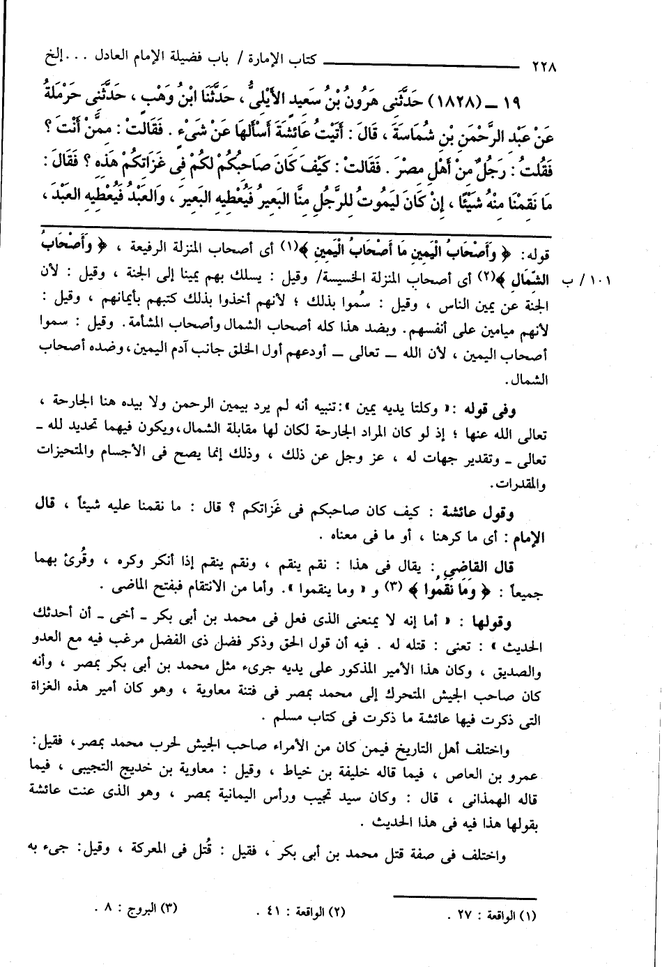 وقولها: " أما إنه لا يمنعنى الذى فعل فى محمد بن أبى بكر - أخى - أن أحدثك الحديث ": تعنى: قتله له. فيه أن قول الحق وذكر فضل ذى الفضل مرغب فيه مع العدو والصديق، وكان هذا الأمير المذكور على يديه جرىء مثل محمد بن أبى بكر بمصر، وأنه كان صاحب الجيش المتحرك إلى محمد بمصر فى فتنة معاوية، وهو كان أمير هذه الغزاة التى ذكرت فيها عائشة ما ذكرت فى كتاب مسلم.
