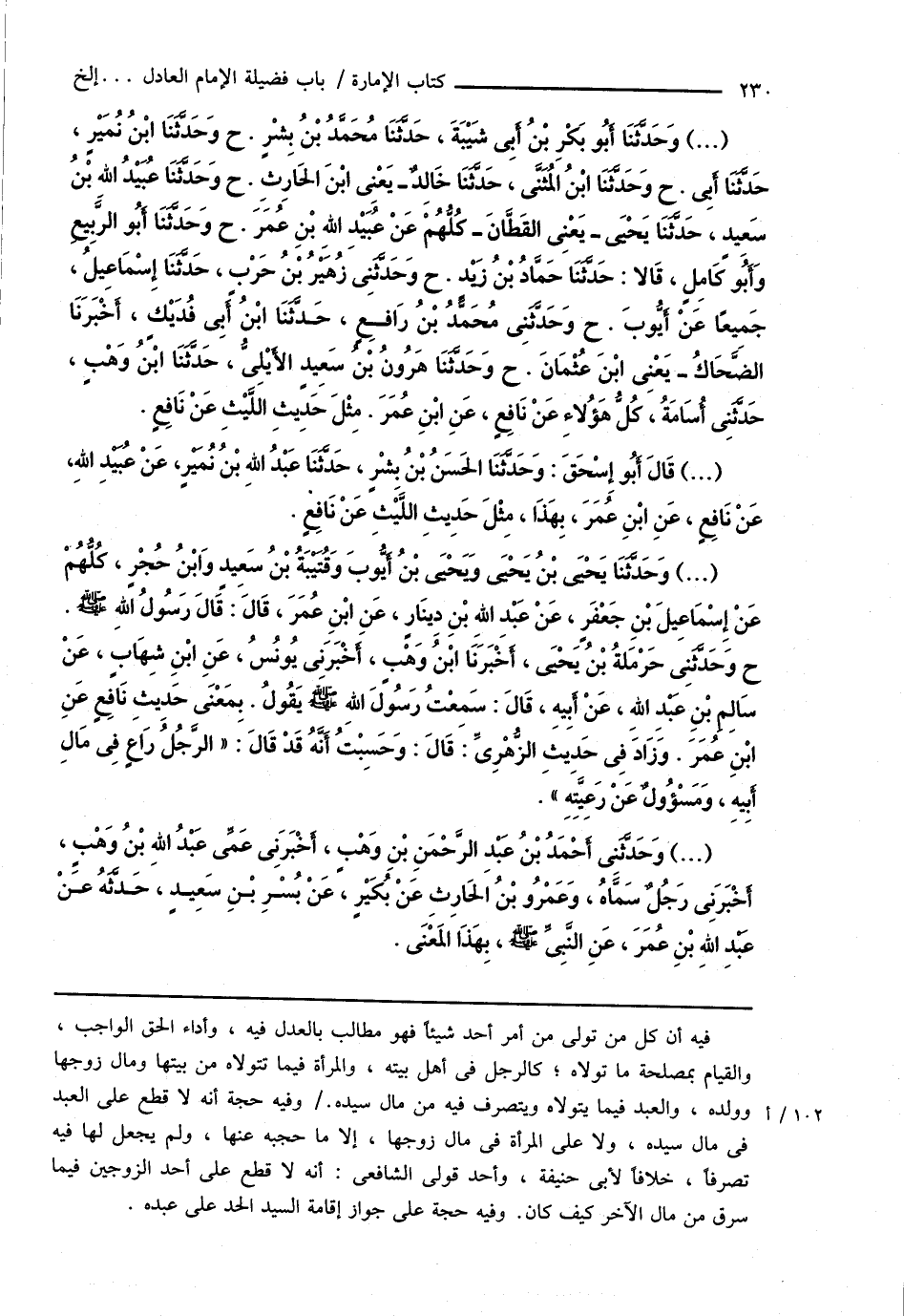 (...) وَحَدَّثَنَا يَحْيَى بْنُ يَحْيَى وَيَحْيَى بْنُ أَيُّوبَ وَقُتَيْبَةُ بْنُ سَعِيدٍ وَابْنِ حُجْرِ، كُلُّهُمْ عَنْ إِسْمَاعِيلَ بْنِ جَعْفَرٍ، عَنْ عَبْدِ اللهِ بْنِ دِينَارٍ، عَنِ ابْنِ عُمَرَ، قَالَ: قَالَ رَسُولُ اللهِ صَلَّى اللهُ عَلَيْهِ وَسَلَّمَ. ح وحَدَّثَنِى حَرْمَلةُ بْنُ يَحْيَى، أَخْبَرَنَا ابْنُ وَهْبٍ، أَخْبَرَنِى يُونُسُ، عَنِ ابْنِ شِهَابٍ، عَنْ سَالِمِ بْنِ عَبْدِ اللهِ، عَنْ أَبِيهِ، قَالَ: سَمِعْتُ رَسُولَ اللهِ صَلَّى اللهُ عَلَيْهِ وَسَلَّمَ يَقُولُ. بِمَعْنَى حَدِيثِ نَافِعٍ عَنِ ابْنِ عُمَرَ. وَزَادَ فِى حَدِيثِ الزُّهْرِىِّ: قَالَ: وَحَسِبْتُ أَنَّهُ قَدْ قَالَ: " الرَّجُلُ رَاعٍ فِى مَالِ أَبِيهِ، وَمسْؤُولٌ عَنْ رَعِيَّتِهِ ".