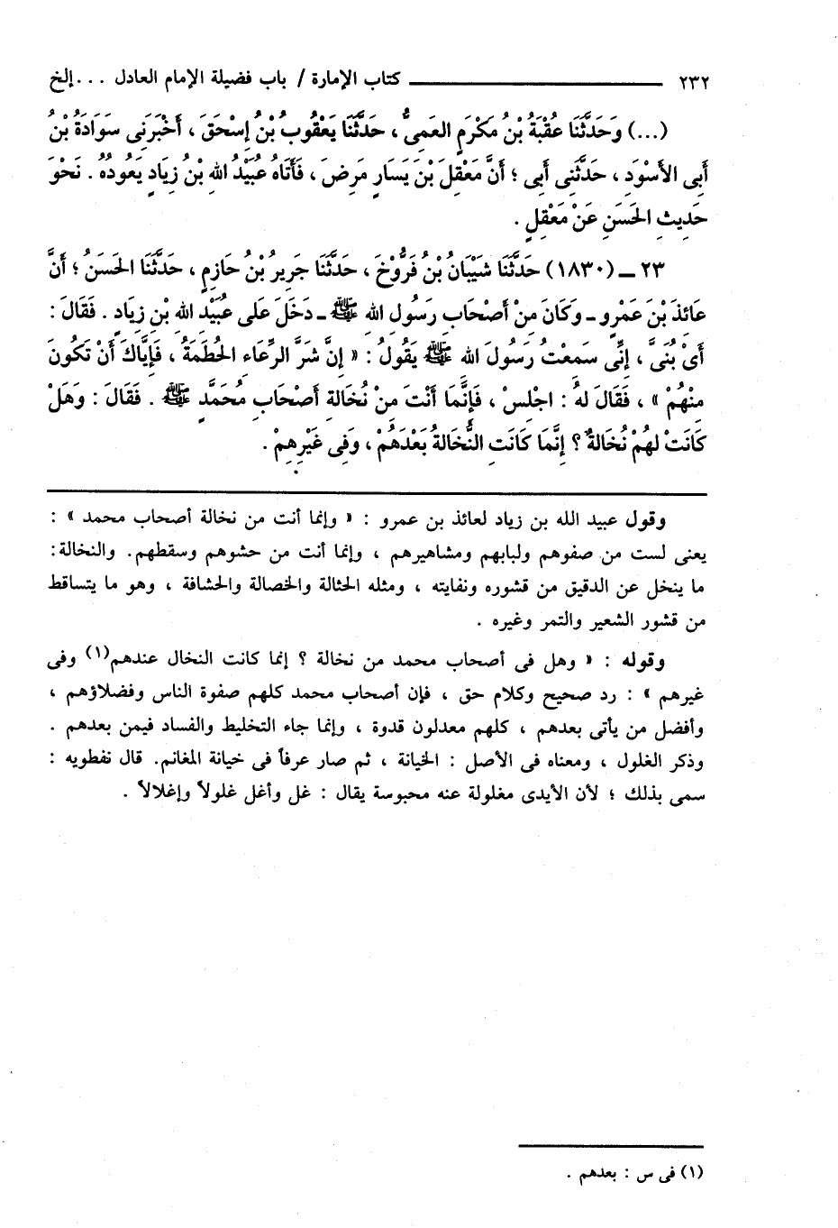 23 - (1830) حَدَّثَنَا شَيْبَانُ بْنُ فَرُّوْخَ، حَدَّثَنَا جَرِيرُ بْنُ حَازِمٍ، حَدَّثَنَا الحَسَنُ؛ أَنَّ عَائِذَ بْنَ عَمْرٍو - وَكَانَ مِنْ أَصْحَابِ رَسُولِ اللهِ صَلَّى اللهُ عَلَيْهِ وَسَلَّمَ - دَخَلَ عَلى عُبَيْدِ اللهِ بْنِ زِيَادٍ. فَقَالَ: أَىْ بُنَىَّ، إِنِّى سَمِعْتُ رَسُولَ اللهِ صَلَّى اللهُ عَلَيْهِ وَسَلَّمَ يَقُولُ: " إِنَّ شَرَّ الرِّعَاءِ الحُطَمَةُ، فَإِيَّاكَ أَنْ تَكُونَ مِنْهُمْ "، فَقَالَ لهُ: اجْلِسْ، فَإِنَّمَا أَنْتَ مِنْ نُخَالةِ أَصْحَابِ مُحَمَّدٍ صَلَّى اللهُ عَلَيْهِ وَسَلَّمَ. فَقَالَ: وَهَلْ كَانَتْ لهُمْ نُخَالةٌ؟ إِنَّمَا كَانَتِ النُّخَالةُ بَعْدَهُمْ، وَفِى غَيْرِهِمْ.