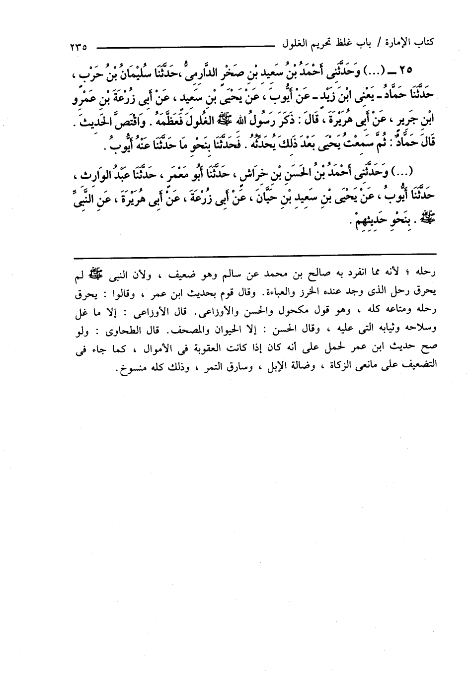 25 - (...) وَحَدَّثَنِى أَحْمَدُ بْنُ سَعِيدِ بْنِ صَخْرٍ الدَّارِمِىُّ، حَدَّثَنَا سُليْمَانُ بْنُ حَرْبٍ، حَدَّثَنَا حَمَّادُ - يَعْنِى ابْنَ زَيْدٍ - عَنْ أَيُّوبَ، عَنْ يَحْيَى بْنِ سَعِيدٍ، عَنْ أَبِى زُرْعَةَ بْنِ عَمْرِو ابْنِ جَرِيرٍ، عَنْ أَبِى هُرَيْرَةَ، قَالَ: ذَكَرَ رَسُولُ اللهِ صَلَّى اللهُ عَلَيْهِ وَسَلَّمَ الغُلولَ فَعَظَّمَهُ. وَاقْتَصَّ الحَدِيثَ. قَالَ حَمَّادٌ: ثُمَّ سَمِعْتُ يَحْيَى بَعْدَ ذَلِكَ يُحَدِّثُهُ. فَحَدَّثَنَا بِنَحْوِ مَا حَدَّثَنَا عَنْهُ أَيُّوبُ.