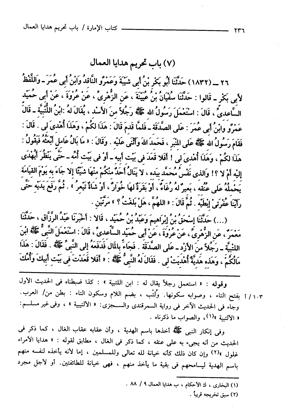 26 - (1832) حَدَّثَنَا أَبُو بَكْرِ بْنُ أَبِى شَيْبَةَ وَعَمْرٌو النَّاقِدُ وَابْنُ أَبِى عُمَرَ - وَاللَّفْظُ لأَبِى بَكْرٍ - تَالوا: حَدَّثَنَا سُفْيَانُ بْنُ عُيَيْنَةَ، عَنِ الزُّهْرِىِّ، عَنْ عُرْوَةَ، عَنْ أَبِى حُمَيْدٍ السَّاعِدِىِّ، قَالَ: اسْتَعْمَلَ رَسُولُ اللهِ صَلَّى اللهُ عَلَيْهِ وَسَلَّمَ رَجُلاً مِنَ الأَسْدِ، يُقَالَ لهُ: ابْنُ اللُّتْبِيَّةِ - قَالَ عَمْرٌو وابْنُ أَبِى عُمَرَ: عَلى الصَّدَقَةِ - فَلمَّا قَدِمَ قَالَ: هَذَا لكُمْ، وَهَذَا أُهْدِىَ لِى. قَالَ: فَقَامَ رَسُولُ اللهِ صَلَّى اللهُ عَلَيْهِ وَسَلَّمَ عَلى المِنْبَرِ، فَحَمِدَ اللهَ وَأَثْنَى عَليْهِ. وَقَالَ: " مَا بَالُ عَامِلٍ أَبْعَثُهُ فَيَقُولُ: هَذَا لكُمْ، وَهَذَا أُهْدِىَ لِى! أَفَلا قَعَدَ فِى بَيْتِ أَبِيهِ - أَوْ فِى بَيْتِ أُمِّهِ - حَتَّى يَنْظُرَ أَيُهْدَى إِليْهِ أَمْ لا؟! وَالذِى نَفْسُ مُحَمَّدٍ بِيَدِهِ، لا يَنَالُ أَحَدٌ مِنْكُمْ مِنْهَا شَيْئًا إِلا جَاءَ بِهِ يَوْمَ القِيَامَةِ يَحْمِلُهُ عَلى عُنُقِهِ، بَعِيرٌ لهُ رُغَاءٌ، أَو بَقَرَةٌ لهَا خُوَارٌ، أَوْ شَاةٌ تَيْعِرُ ". ثُمَّ رَفَعَ يَدَيْهِ حَتَّى رَأَيْنَا عُفْرَتىْ إِبْطَيْهِ. ثُمَّ قَالَ: " اللهُمَّ، هَلْ بَلغْتُ؟ " مَرَّتَيْنِ.