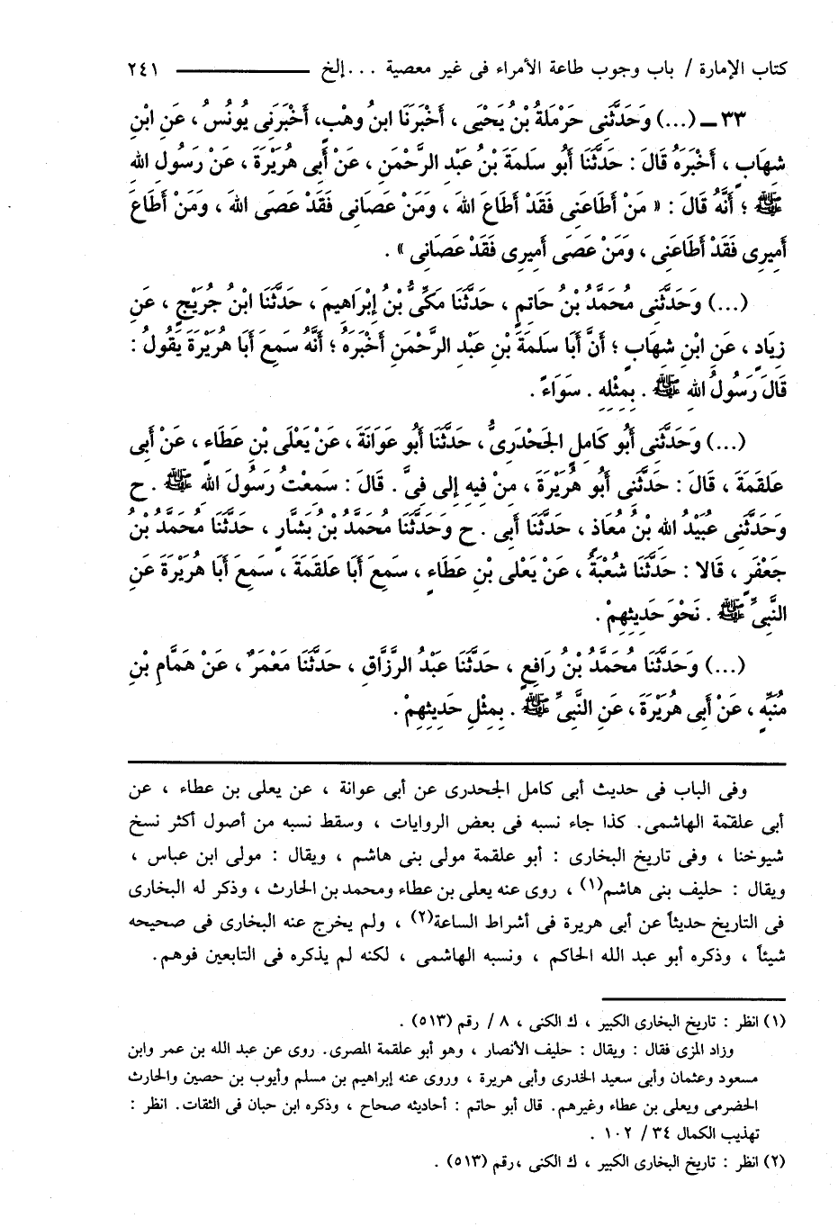 33 - (...) وَحَدَّثَنِى حَرْمَلةُ بْنُ يَحْيَى، أَخْبَرَنَا ابْنُ وَهْبٍ، أَخْبَرَنِى يُونُسُ، عَنِ ابْنِ شِهَابٍ، أَخْبَرَهُ قَالَ: حَدَّثَنَا أَبُو سَلمَةَ بْنُ عَبْدِ الرَّحْمَنِ، عَنْ أَبِى هُرَيْرَةَ، عَنْ رَسُولِ اللهِ صَلَّى اللهُ عَلَيْهِ وَسَلَّمَ؛ أَنَّهُ قَالَ: " مَنْ أَطَاعَنِى فَقَدْ أَطَاعَ اللهَ، وَمَنْ عَصَانِى فَقَدْ عَصَى اللهَ، وَمَنْ أَطَاعَ أَمِيرِى فَقَدْ أَطَاعَنِى، وَمَنْ عَصَى أَمِيرِى فَقَدْ عَصَانِى ".