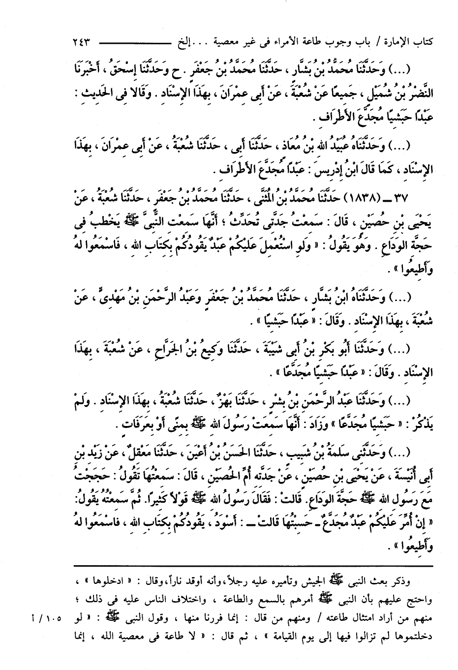 (...) وَحَدَّثَنِى سَلمَةُ بْنُ شَبِيبٍ، حَدَّثَنَا الحَسَنُ بْنُ أَعْيَنَ، حَدَّثَنَا مَعْقِلٌ، عَنْ زَيْدِ بْنِ أَبِى أُنَيْسَةَ، عَنْ يَحْيَى بْنِ حُصَيْنٍ، عَنْ جَدَّتِهِ أُمِّ الحُصَيْنِ، قَالَ: سَمِعْتُهَا تَقُولُ: حَجَجْتُ مَعَ رَسُولِ اللهِ صَلَّى اللهُ عَلَيْهِ وَسَلَّمَ حَجَّةَ الوَدَاعِ. قَالتْ: فَقَالَ رسُولُ اللهِ صَلَّى اللهُ عَلَيْهِ وَسَلَّمَ قَوْلاً كَثِيرًا. ثُمَّ سَمِعْتُهُ يَقُولُ: " إِنْ أُمِّرَ عَليْكُمْ عَبْدٌ مُجَدَّعٌ - حَسِبْتُهَا قَالتْ -: أَسْوَدُ، يَقُودُكُمْ بِكِتَابِ اللهِ، فاسْمَعُوا لهُ وَأَطِيعُوا ".