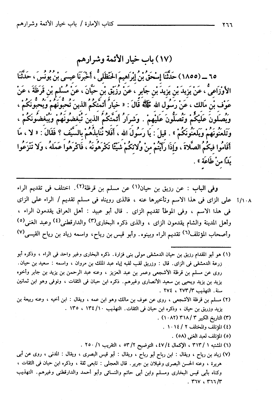 65 - (1855) حَدَّثَنَا إِسْحَاقُ بْنُ إِبْرَاهِيمَ الحَنْظَلِىُّ، أَخْبَرَنَا عِيسَى بْنُ يُونُسَ، حَدَّثَنَا الأَوْزَاعِىُّ، عَنْ يَزِيدَ بْنِ يَزِيدَ بْنِ جَابِرٍ، عَنْ رُزَيْقِ بْنِ حَيَّانَ، عَنْ مُسْلِمِ بْنِ قَرَظَةَ، عَنْ عَوْفِ بْنِ مَالِكٍ، عَنْ رَسُولِ اللهِ صَلَّى اللهُ عَلَيْهِ وَسَلَّمَ قَالَ: " خِيَارُ أَئِمَّتِكُمُ الذِينَ تُحِبُّونَهُمْ وَيُحِبُّونَكُمْ، وَيُصَلونَ عَلَيْكُمْ وَتُصَلُّونَ عَليْهِمْ. وَشِرَارُ أَئِمَّتِكُمُ الذِينَ تُبْغِضُونَهُمْ ويُبْغضُونَكُمْ، وَتَلعَنُونَهُمْ وَيَلعَنُونَكُمْ ". قِيلَ: يَا رَسُولَ اللهِ، أَفَلا نُنَابِذُهُمْ بِالسَّيْفِ؟ فَقَالَ: " لا، مَا أَقَامُوا فِيكُمُ الصَّلاةَ، وَإِذَا رَأَيْتُمْ مِنْ وُلاتِكُمْ شَيْئًا تَكْرَهُونَهُ، فَاكْرَهُوا عَمَلهُ، وَلا تَنْزَعُوا يَدًا مِنْ طَاعَةٍ ".