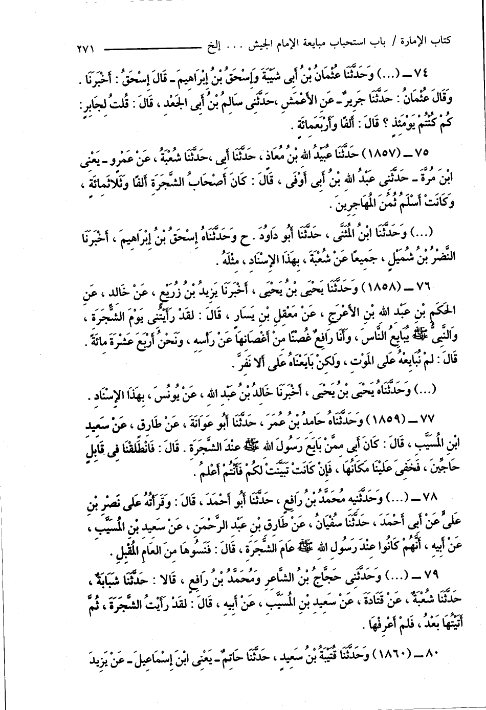 78 - (...) وَحَدَّثَنِيهِ مُحَمَّدُ بْنُ رَافِعٍ، حَدَّثَنَا أَبُو أَحْمَدَ، قَالَ: وَقَرَأتُهُ عَلى نَصْرِ بْنِ عَلىٍّ عَنْ أَبِى أَحْمَدَ، حَدَّثَنَا سُفْيَانُ، عَنْ طَارِقِ بْنِ عَبْدِ الرَّحْمَنِ، عَنْ سَعِيدِ بْنِ المُسَيَّبِ، عَنْ أَبِيهِ، أَنَّهُمْ كَانُوا عِنْدَ رَسُولِ اللهِ صَلَّى اللهُ عَلَيْهِ وَسَلَّمَ عَامَ الشَّجَرَةِ، قَالَ: فَنَسُوهَا مِنَ العَامِ المُقْبِلِ. 79 - (...) وَحَدَّثَنِى حَجَّاجُ بْنُ الشَّاعِرِ وَمُحَمَّدُ بْنُ رَافِعٍ، قَالا: حَدَّثَنَا شَبَابَةٌ، حَدَّثَنَا شُعْبَةُ، عَنْ قَتَادَةَ، عَنْ سَعِيدِ بْنِ المُسَيَّبِ، عَنْ أَبِيهِ، قَالَ: لقَدْ رَأَيْتُ الشَّجَرَةَ، ثُمَّ أَتَيْتُهَا بَعْدُ، فَلمْ أَعْرِفْهَا.