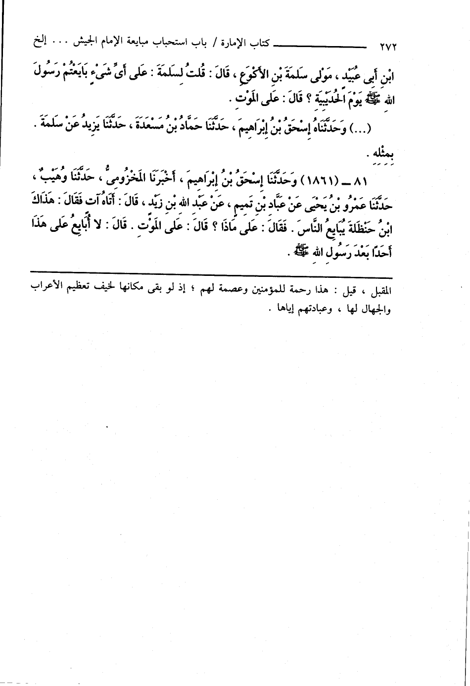 81 - (1861) وَحَدَّثَنَا إسْحَاقُ بْنُ إبْرَاهِيمَ، أَخْبَرَنَا المَخْزُومِىُّ، حَدَّثَنَا وُهَيْبٌ، حَدَّثَنَا عَمْرُو بْنُ يَحْيَى عَنْ عَبَّادِ بْنِ تَمِيمٍ، عَنْ عَبْدِ اللهِ بْنِ زَيْدٍ، قَالَ: أَتَاهُ آتٍ فَقَالَ: هَذَاكَ ابْنُ حَنْظَلةَ يُبَايِعُ النَّاسَ. فَقَالَ: عَلىَ مَاذَا؟ قَالَ: عَلى المَوْتِ. قَالَ: لا أُبَايِعُ عَلى هَذَا أَحَدًا بَعْدَ رَسُولِ اللهِ صَلَّى اللهُ عَلَيْهِ وَسَلَّمَ.