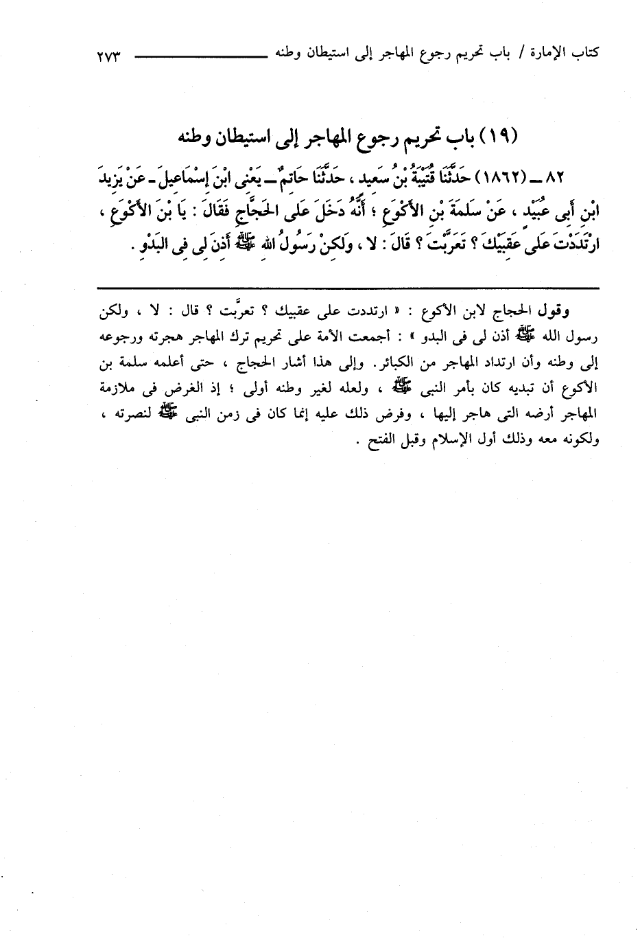 82 - (1862) حَدَّثَنَا قُتَيْبَةُ بْنُ سَعِيدٍ، حَدَّثَنَا حَاتِمٌ - يَعْنِى ابْنَ إِسْمَاعِيلَ - عَنْ يَزِيدَ ابْنِ أَبِى عُبَيْدٍ، عَنْ سَلمَةَ بْنِ الأَكْوَعِ؛ أَنَّهُ دَخَلَ عَلى الحَجَّاجِ فَقَالَ: يَا بْنَ الأَكْوَعِ، ارْتَدَدْتَ عَلى عَقِبَيْكَ؟ تَعَرَّبْتَ؟ قَالَ: لا، وَلكِنْ رَسُولُ اللهِ صَلَّى اللهُ عَلَيْهِ وَسَلَّمَ أَذِنَ لِى فِى البَدْوِ.