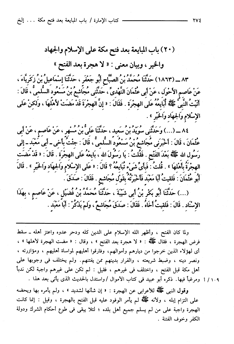 84 - (...) وَحَدَّثَنِى سُوَيْدُ بْنُ سَعِيدٍ، حَدَّثَنَا عَلِىُّ بْنُ مُسْهِرٍ، عَنْ عَاصِمٍ، عَنْ أَبِى عُثْمَانَ، قَالَ: أَخْبَرَنِى مُجَاشِعُ بْنُ مَسْعُودٍ السُّلمِىُّ، قَالَ: جِئْتُ بِأَخِى - أَبِى مَعْبَدٍ - إِلَى رَسُولِ اللهِ صَلَّى اللهُ عَلَيْهِ وَسَلَّمَ بَعْدَ الفَتْحِ. فَقُلْتُ: يَا رَسُولَ اللهِ، بَايعْهُ عَلى الهِجْرَةِ. قَالَ: " قَدْ مَضَتِ الهِجْرَةُ بِأَهْلِهَا ". قُلْتُ: فَبِأىِّ شَىْءٍ تُبَايِعُهُ؟ قَالَ: " عَلى الإِسْلامِ وَالجِهَادِ وَالخَيْرِ ". قَالَ أَبُو عُثْمَانَ: فَلقِيتُ أَبَا مَعْبَدٍ فَأَخْبَرْتُهُ بِقَوْلِ مُجَاشِعٍ. فَقَالَ: صَدَقَ.