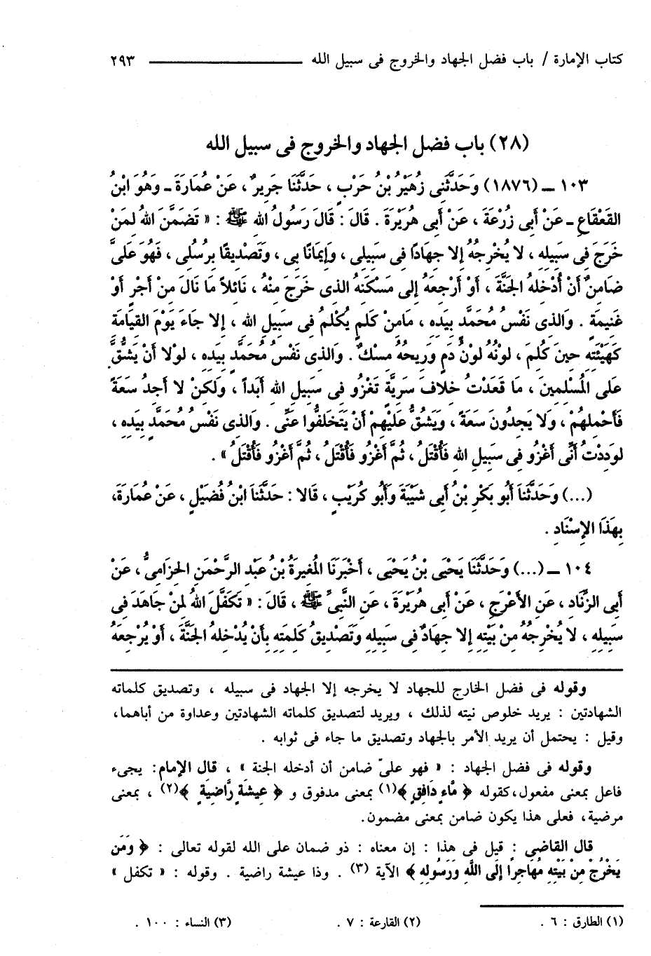 103 - (1876) وَحَدَّثَنِى زُهَيْرُ بْنُ حَرْبٍ، حَدَّثَنَا جَرِيرٌ، عَنْ عُمَارَةَ - وَهُوَ ابْنُ القَعْقَاعِ - عَنْ أَبِى زُرْعَةَ، عَنْ أَبِى هُرَيْرَةَ. قَالَ: قَالَ رَسُولُ اللهِ صَلَّى اللهُ عَلَيْهِ وَسَلَّمَ: " تَضَمَّنَ اللهُ لمَنْ خَرَجَ فى سَبِيلِهِ، لا يُخْرِجُهُ إلا جِهَادًا فِى سَبِيلِى، وَإِيمَانًا بِى، وَتَصْدِيقًا بِرُسُلِى، فَهُوَ عَلىَّ ضَامِنٌ أَنْ أُدْخِلهُ الجَنَّةَ، أَوْ أَرْجِعَهُ إِلَى مَسْكَنِهُ الذِى خَرَجَ مِنْهُ، نَائِلاً مَا نَالَ مِنْ أَجْرٍ أَوْ غَنِيمَةٍ. وَالذِى نَفْسُ مُحَمَّدٍ بِيَدِهِ، مَا مِنْ كَلَمٍ يُكْلمُ فِى سَبِيلِ اللهِ، إِلا جَاءَ يَوْمَ القِيَامَةِ كَهَيْئَتِهِ حِينَ كُلِمَ، لوْنُهُ لوْنُ دَمٍ وَرِيحُهُ مِسْكٌ. وَالذِى نَفْسُ مُحَمَّدٍ بِيَدِهِ، لوْلا أَنْ يَشُّقَّ عَلىَ المُسْلِمِينَ، مَا قَعَدْتُ خِلافَ سَرِيَّةٍ تَغْزُو فِى سَبِيلِ اللهِ أَبَداً، وَلكَنْ لا أَجِدُ سَعَةً فَأَحْمِلهُمْ، وَلا يَجِدُونَ سَعَةً، وَيَشُّقُّ عَليْهِمْ أَنْ يَتَخَلفُّوا عَنِّى. وَالذِى نَفْسُ مُحَمَّدٍ بِيَدِهِ، لوَدِدْتُ أَنِّى أَغْزُو فِى سَبِيلِ اللهِ فَأُقْتَلُ، ثُمَّ أَغْزُو فَأُقْتَلُ، ثُمَّ أَغْزُو فَأُقْتَلُ ".