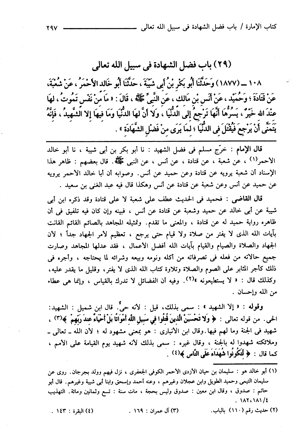108 - (1877) وَحَدَّثَنَا أَبُو بَكْرِ بْنُ أَبِى شَيْبَةَ، حَدَّثَنَا أَبُو خَالِدٍ الأَحْمَرُ، عَنْ شُعْبَةَ، عَنْ قَتَادَةَ؛ وَحُمَيْد، عَنْ أَنَسِ بْنِ مَالِكٍ، عَنِ النَّبِىِّ صَلَّى اللهُ عَلَيْهِ وَسَلَّمَ، قَالَ: " مَا مِنْ نَفْسٍ تَمُوتُ، لهَا عِنْدَ اللهِ خَيْرٌ، يَسُرُّهَا أَنَّهَا تَرْجِعُ إِلَى الدُّنْيَا، وَلا أَنَّ لهَا الدُّنْيَا وَمَا فِيهَا إِلا الشَّهِيدُ، فَإِنَّهُ يَتَمَنَّى أَنْ يَرْجِعَ فَيُقْتَلَ فِى الدُّنْيَا؛ لِمَا يَرَى مِنْ فَضْلِ الشَّهَادَةِ ".