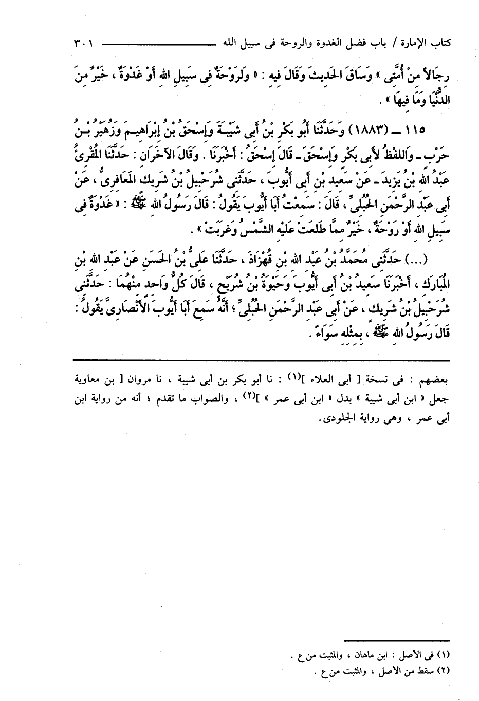 115 - (1883) وَحَدَّثَنَا أَبُو بَكْرِ بْنُ أَبِى شَيْبَةَ وَإِسْحَاقُ بْنُ إِبْرَاهِيمَ وَزُهَيْرُ بْنُ حَرْبٍ - وَاللفْظُ لأَبِى بَكْرٍ وَإِسْحَاقَ - قَالَ إِسْحَاقُ: أَخْبَرَنَا. وَقَالَ الآخَرَانِ: حَدَّثَنَا المُقْرِئُ عَبْدُ اللهِ بْنُ يَزِيدَ - عَنْ سَعِيدِ بْنِ أَبِى أَيُّوبَ، حَدَّثَنِى شُرَحْبِيلُ بْنُ شَرِيكٍ المَعَافِرِىُّ، عَنْ أَبِى عَبْدِ الرَّحْمَنِ الحُبُلِىِّ، قَالَ: سَمِعْتُ أَبَا أَيُّوبَ يَقُولُ: قَالَ رَسُولُ اللهِ صَلَّى اللهُ عَلَيْهِ وَسَلَّمَ:" غَدْوَةٌ فِى سَبِيلِ اللهِ أَوْ رَوْحَةٌ، خَيْرٌ مِمَّا طَلعَتْ عَليْهِ الشَّمْسُ وَغرَبَتْ ".