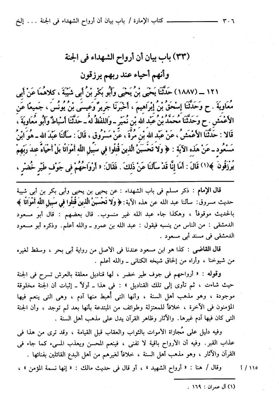 121 - (1887) حَدَّثَنَا يَحْيَى بْنُ يَحْيَى وَأَبُو بَكْرِ بْنُ أَبِى شَيْبَةَ، كِلاهُمَا عَنْ أَبِى مُعَاوِيَةَ. ح وَحَدَّثَنَا إِسْحَاقُ بْنُ إِبْرَاهِيمَ، أَخْبَرَنَا جَرِيرٌ وَعِيسى بْنُ يُونُسَ، جَمِيعًا عَنِ الأَعْمَشِ. ح وَحَدَّثَنَا مُحَمَّدُ بْنُ عَبْدِ اللهِ بْنِ نُمَيْرٍ - وَاللفْظُ لهُ - حَدَّثَنَا أسْباطٌ وَأَبُو مُعَاوِيَةَ، قَالا: حَدَّثَنَا الأَعْمَشُ، عَنْ عَبْدِ اللهِ بْنِ مُرَّةَ، عَنْ مَسْرُوقٍ، قَالَ: سَأَلنَا عَبْدَ اللهِ - هُوَ ابْنُ مَسْعُودٍ - عَنْ هَذِهِ الآيَةِ: {وَلا تَحْسَبَنَّ الَّذِينَ قُتِلُوا فِي سَبِيلِ اللَّهِ أَمْوَاتًا بَلْ أَحْيَاءٌ عِندَ رَبِّهِمْ يُرْزَقُونَ (¬1) قَالَ: أَمَا إِنَّا قَدْ سَأَلنَا عَنْ ذَلِكَ. فَقَالَ: " أَرْوَاحُهُمْ فِى جَوْفِ طَيْرٍ خُضْرٍ،
