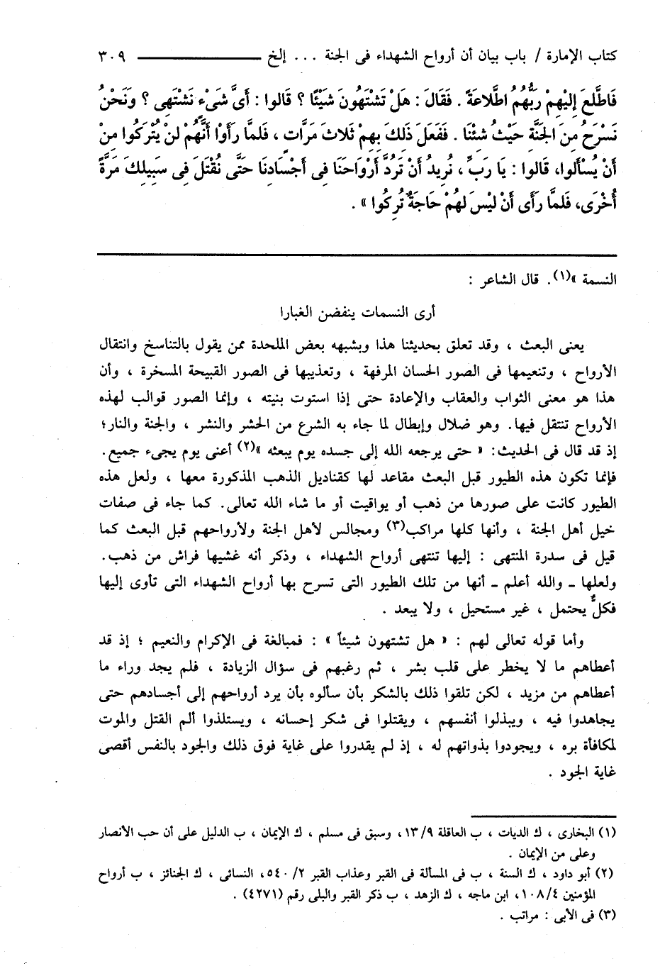 فَاطَّلعَ إِليْهِمْ رَبُّهُمُ اطَّلاعَةً. فَقَالَ: هَلْ تَشْتَهُونَ شَيْئًا؟ قَالوا: أَىَّ شَىْءٍ نَشْتَهِى؟ وَنَحْنُ نَسْرَحُ مِنَ الجَنَّةِ حَيْثُ شِئْنَا. فَفَعَلَ ذَلِكَ بِهِمْ ثَلاثَ مَرَّاتٍ، فَلمَّا رَأَوْا أَنَّهُمْ لنْ يُتْرَكُوا مِنْ أَنْ يُسْأَلوا، قَالوا: يَا رَبِّ، نُرِيدُ أَنْ تَرُدَّ أَرْوَاحَنَا فِى أَجْسَادِنَا حَتَّى نُقْتَلَ فِى سَبِيلِكَ مَرَّةً أُخْرَى، فَلمَّا رَأَى أَنْ ليْسَ لهُمْ حَاجَةٌ تُرِكُوا ".
