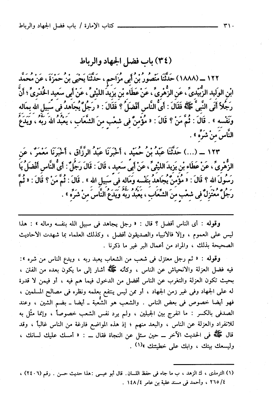 122 - (1888) حَدَّثَنَا مَنْصُورُ بْنُ أَبِى مُزَاحِمٍ، حَدَّثَنَا يَحْيَى بْنُ حَمْزَةَ، عَنْ مُحَمَّد ابْنِ الوَلِيدِ الزُّبَيْدِىِّ، عَنِ الزُّهْرِىِّ، عَنْ عَطَاءِ بْنِ يَزِيدَ الليْثِىِّ، عَنْ أَبِى سَعِيدٍ الخُدْرِىِّ؛ أَنَّ رَجُلاً أَتَى النَّبِىَّ صَلَّى اللهُ عَلَيْهِ وَسَلَّمَ فَقَالَ: أَىُّ النَّاسِ أَفْضَلُ؟ فَقَالَ: " رَجُلٌ يُجَاهِدُ فِى سَبِيلِ اللهِ بِمَالِهِ وَنَفْسِهِ ". قَالَ: ثُمَّ مَنْ؟ قَالَ: " مُؤْمِنٌ فِى شِعْبٍ مِنَ الشَّعَابِ، يَعْبُدُ اللهَ رَبَّهُ، وَيَدَعُ النَّاسَ مِنْ شَرِّهِ ".