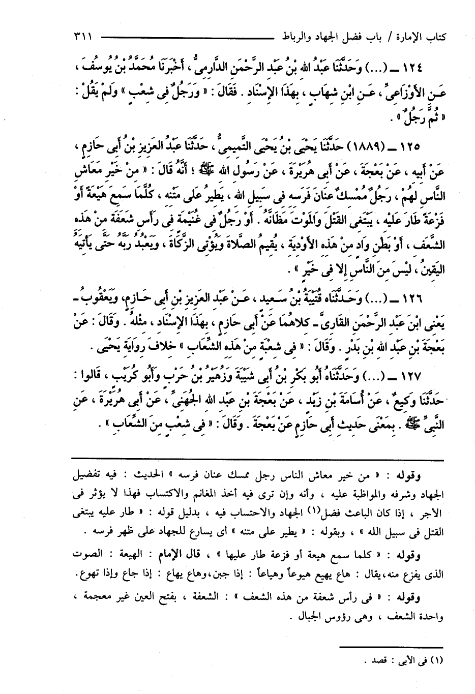 125 - (1889) حَدَّثَنَا يَحْيَى بْنُ يَحْيَى التَّمِيمِىُّ، حَدَّثَنَا عَبْدُ العَزِيزِ بْنُ أَبِى حَازِمٍ، عَنْ أَبِيهِ، عَنْ بَعْجَةَ، عَنْ أَبِى هُرَيْرَةَ، عَنْ رَسُولَ الله صَلَّى اللهُ عَلَيْهِ وَسَلَّمَ؛ أَنَّهُ قَالَ: " مِنْ خَيْرِ مَعَاشِ النَّاسِ لهُمْ، رَجُلٌ مُمْسِكٌ عِنَانَ فَرَسِهِ فِى سَبِيلِ اللهِ، يَطَيرُ عَلى مَتْنِهِ، كُلَّمَا سَمِعَ هَيْعَةً أَوْ فَزْعَةً طَارَ عَليْهِ، يَبْتَغِى القَتْلَ وَالمَوْتَ مَظَانَّهُ. أَوْ رَجُلٌ فِى غُنَيْمَةٍ فِى رَأسِ شَعَفَة منْ هَذِهِ الشَّعَفِ، أَوْ بَطَنِ وَادٍ مِنْ هَذِهِ الأَوْدِيَةِ، يُقِيمُ الصَّلاةَ وُيؤْتِى الزَّكَاةَ، وَيَعْبُدُ رَبَّهُ حَتَّى يَأتِيَهُ اليَقِينُ، ليْسَ مِنَ النَّاسِ إِلا فِى خَيْرٍ ".