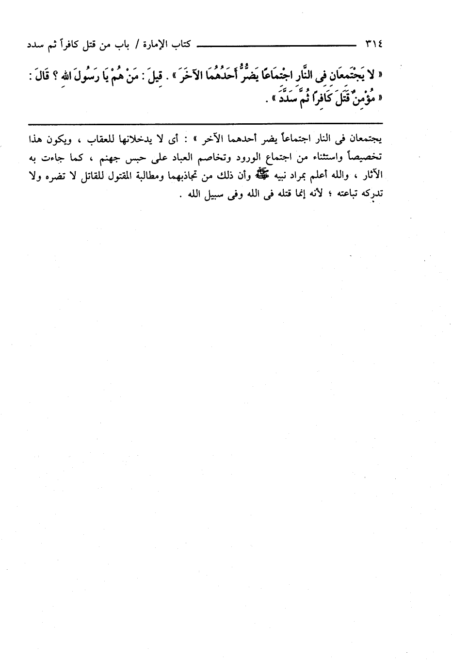 " لا يَجْتَمِعَانِ فِى النَّارِ اجْتِمَاعًا يَضُّرُّ أَحَدُهُمَا الآخَرَ ". قِيلَ: مَنْ هُمْ يَا رَسُولَ اللهِ؟ قَالَ: " مُؤْمِنٌ قَتَلَ كَافِرًا ثُمَّ سَدَّدَ ".