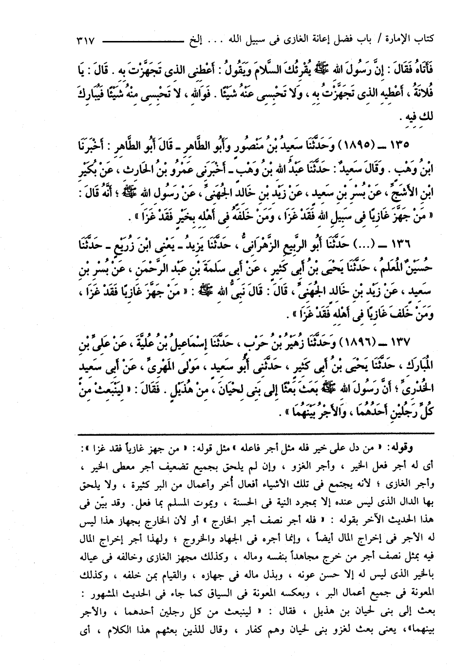 135 - (1895) وَحَدَّثَنَا سَعِيدُ بْنُ مَنْصُورٍ وَأَبُو الطَّاهِرِ - قَالَ أَبُو الطَّاهِرِ: أَخْبَرَنَا ابْنُ وَهْبٍ. وَقَالَ سَعِيدٌ: حَدَّثَنَا عَبْدُ اللهِ بْنُ وَهْبٍ - أَخْبَرَنِى عَمْرُو بْنُ الحَارِثِ، عَنْ بُكَيْرِ ابْنِ الأَشَجِّ، عَنْ بُسْرِ بْنِ سَعيدٍ، عَنْ زَيْدِ بْنِ خَالِدٍ الجُهَنِىِّ، عَنْ رَسُولِ اللهِ صَلَّى اللهُ عَلَيْهِ وَسَلَّمَ؛ أَنَّهُ قَالَ: " مَنْ جَهَّزَ غَازِيًا فِى سَبِيلِ اللهِ فَقَدْ غَزَا، وَمَنْ خَلَفَهُ فِى أَهْلِهِ بِخَيْرٍ فَقَدْ غَزَا ".