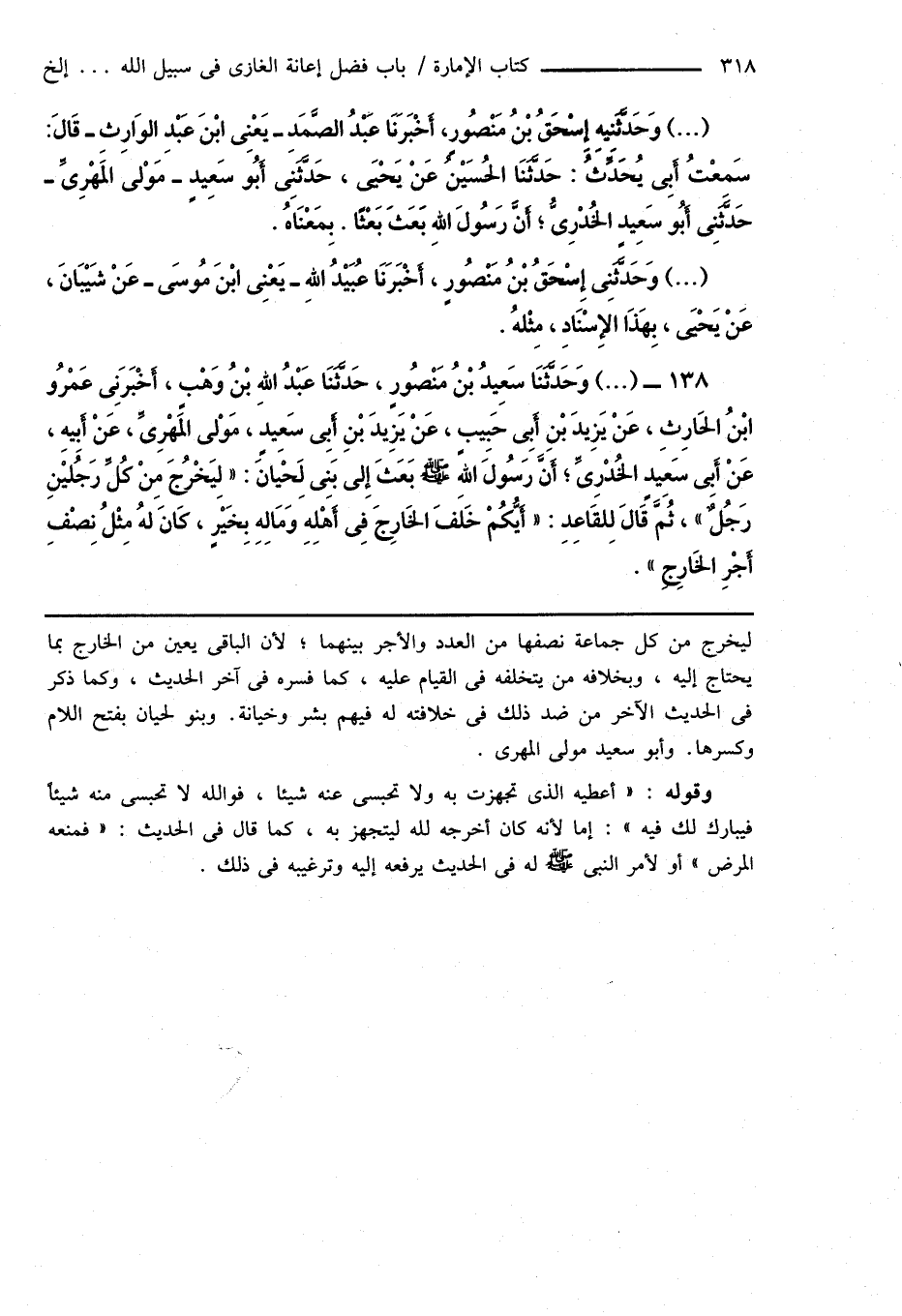 138 - (...) وَحَدَّثَنَا سَعِيدُ بْنُ مَنْصُورٍ، حَدَّثَنَا عَبْدُ اللهِ بْنُ وَهْبٍ، أَخْبَرَنِى عَمْرُو ابْنُ الحَارِثِ، عَنْ يَزِيدَ بْنِ أَبِى حَبِيبٍ، عَنْ يَزِيدَ بْنِ أَبِى سَعيدٍ، مَوْلى المَهْرِىِّ، عَنْ أَبِيهِ، عَنْ أَبِى سَعِيدٍ الخُدْرِىِّ؛ أَنَّ رَسُولَ اللهِ صَلَّى اللهُ عَلَيْهِ وَسَلَّمَ بَعَثَ إِلَى بَنِى لَحْيَانَ: " لِيَخْرُجَ مِنْ كُلِّ رَجُليْنِ رَجُلٌ "، ثُمَّ قَالَ لِلقَاعِدِ: " أَيُّكُمْ خَلفَ الخَارِجَ فِى أَهْلِهِ وَمَالِهِ بِخَيْرٍ، كَانَ لهُ مِثْلُ نِصْفِ أَجْرِ الخَارِجِ ".
