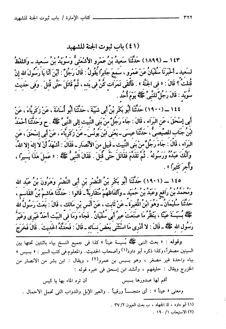 144 - (1900) حَدَّثَنَا أَبُو بَكْرِ بْنُ أَبِى شَيْبَةَ، حَدَّثَنَا أَبُو أُسَامَةَ، عَنْ زَكَريَّاءَ، عَنْ أَبِى إِسْحَاقَ، عَنِ الْبَرَاءِ، قَالَ: جَاءَ رَجُلٌ مِنْ بَنِى النَّبِيتِ إِلَى النَّبِىِّ صَلَّى اللهُ عَلَيْهِ وَسَلَّمَ. ح وَحَدَّثَنَا أَحْمَدُ ابْنُ جَنَابٍ المِصِّيصِىُّ، حَدَّثَنَا عِيسَى - يَعْنِى ابْنَ يُونُسَ - عَنْ زَكَرِيَّاءَ، عَنْ أَبِى إِسْحَاقَ، عَنِ البَرَاءِ، قَالَ: جَاءَ رَجُلٌ مِنْ بَنِى النَّبِيتِ - قَبِيلٍ مِنَ الأَنْصَارِ - فَقَالَ: أَشْهَدُ أَنْ لا إِلهَ إِلا اللهُ، وَأَنَّكَ عَبْدُهُ وَرَسُولهُ. ثُمَّ تَقَدَّمَ فَقَاتَلَ حَتَّى قُتِلَ. فَقَالَ النَّبِىُّ صَلَّى اللهُ عَلَيْهِ وَسَلَّمَ: " عَمِلَ هَذَا يَسِيرًا، وَأُجِرَ كَثِيرًا ".