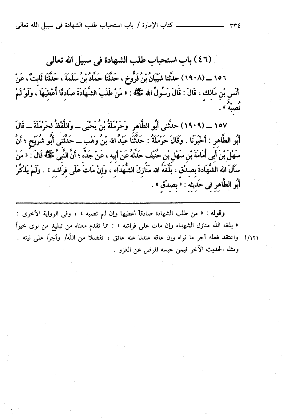 157 - (1909) حدَّثنى أَبُو الطَّاهِرِ وَحَرْمَلَةُ بْنُ يَحْيَى - وَاللَّفْظُ لحَرْمَلَةَ - قَالَ أَبُو الطَّاهِرِ: أَخْبَرَنَا. وَقَالَ حَرْمَلَةُ: حَدَّثَنَا عَبْدُ الله بْنُ وَهْبٍ - حَدَّثَنِى أَبُو شُرَيْحٍ؛ أَنَّ سَهْلَ بْنَ أَبِى أُمَامَةَ بْنِ سَهْلِ بْنِ حُنَيْفٍ حَدَّثهُ عَنْ أَبِيهِ، عَنْ جَدِّهِ؛ أَنَّ النَّبِىَّ صَلَّى اللهُ عَلَيْهِ وَسَلَّمَ قَالَ: " مَنْ سَأَلَ الله الشَّهَادةَ بِصِدْقٍ، بَلَّغَهُ الله مَنَازِلَ الشُّهَدَاءِ، وَإِنْ مَاتَ عَلَى فِرَاشِهِ ". وَلَمْ يَذْكُرْ أَبُو الطَّاهِرِ فِى حَدِيثِهِ: " بِصِدْقٍ ".