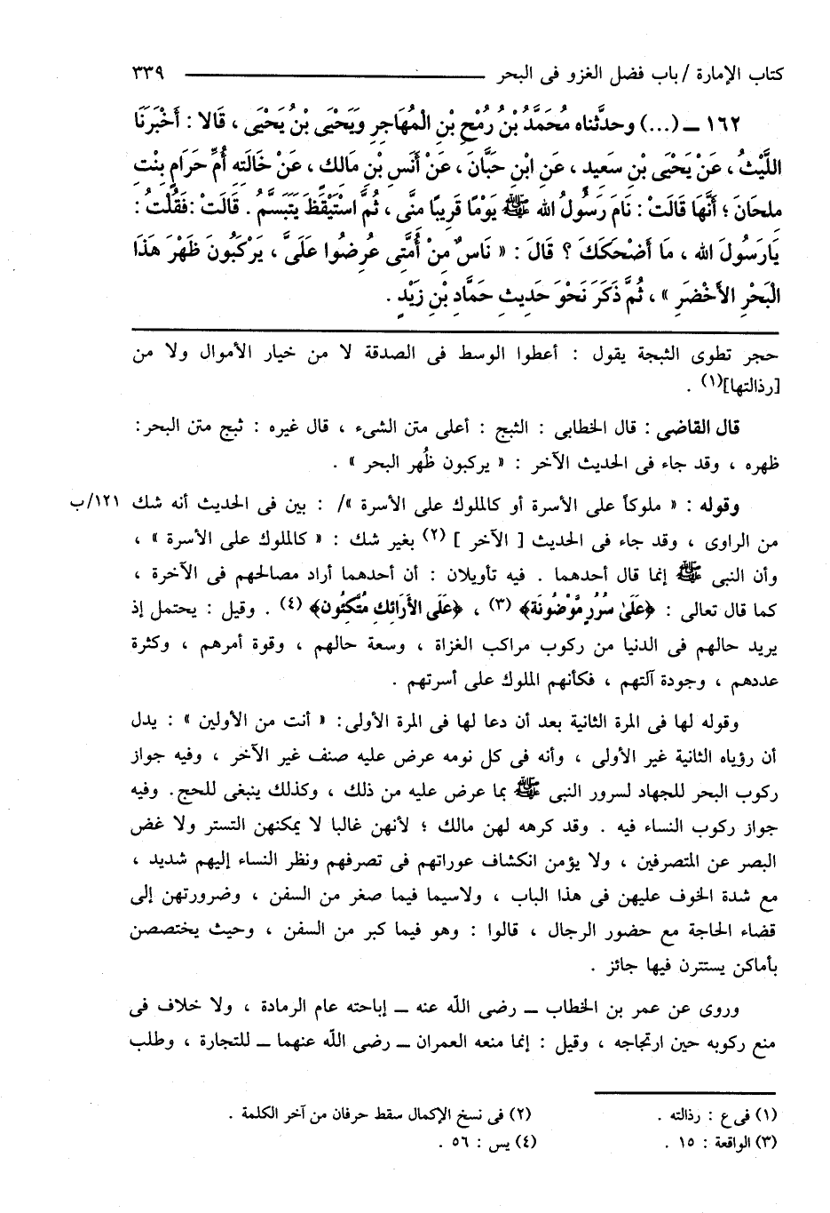 162 - (...) وحدَّثناه مُحَمَّدُ بْنُ رُمْحِ بْنِ المُهَاجِرِ وَيَحْيَى بْنُ يَحْيَى، قَالا: أَخْبَرَنَا اللَّيْثُ، عَنْ يَحْيَى بْنِ سَعِيدٍ، عَنِ ابْنِ حَبَّانَ، عَنْ أَنَسِ بْنِ مَالِكٍ، عَنْ خَالَتِهِ أُمِّ حَرَامِ بِنْتِ مِلحَانَ؛ أَنَّهَا قَالَتْ: نَامَ رَسُولُ اللهِ صَلَّى اللهُ عَلَيْهِ وَسَلَّمَ يَوْمًا قَرِيبًا مِنّى، ثُمَّ اسْتَيْقَظَ يَتَبَسَّمُ. قًالَتْ: فَقُلْتُ: يَا رَسُولَ الله، مَا أَضْحَكَكَ؟ قَالَ: " نَاسٌ مِنْ أُمَّتِى عُرِضُوا عَلَىَّ، يرْكَبُونَ ظَهْرَ هَذَا الْبَحْرِ الأَخْضَرِ "، ثُمَّ ذَكَرَ نَحْوَ حَدِيثِ حَمَّادِ بْنِ زَيْدٍ.