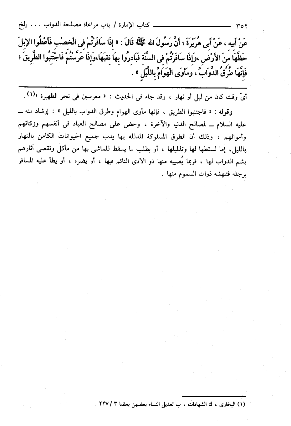 وقوله: " فاجتنبوا الطريق، فإنها مأوى الهوام وطرق الدواب بالليل ": إرشاد منه - عليه السلام - لمصالح الدنيا والآخرة، وحض على مصالح العباد فى أنفسهم وزكاتهم وأموالهم، وذلك أن الطرق المسلوكة المذلّلة بها يدب جميع الحيوانات الكامن بالنهار بالليل، إما لسقطها لها وتذليلها، أو بطلب ما يسقط للماشى بها من مأكل وتقصى آثارهم بشم الدواب لها، فربما يُصيبه منها ذو الأذى النائم فيها، أو يضره، أو يطأ عليه المسافر برجله فتنهشه ذوات السموم منها.