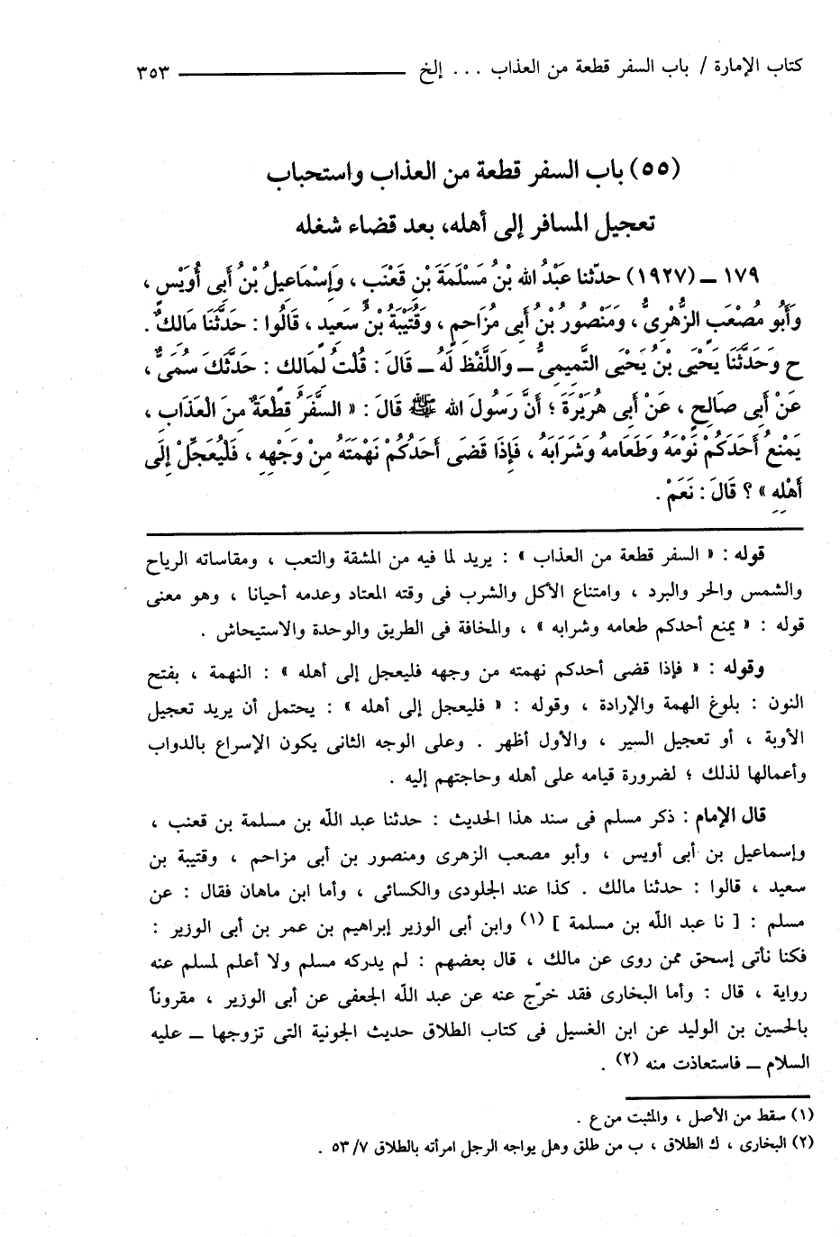 179 - (1927) حدَّثنا عَبْدُ اللهِ بْنُ مَسْلَمَةَ بْنِ قَعْنَبٍ، وَإسْمَاعِيلُ بْنُ أَبِى أُوَيْسٍ، وَأَبُو مُصْعَبٍ الزُّهْرِىُّ، وَمَنْصُورُ بْنُ أَبِى مُزَاحِمٍ، وَقُتَيْبَةُ بْنُ سَعِيدٍ، قَالُوا: حَدَّثَنَا مَالِكٌ. ح وَحَدَّثَنَا يَحْيَى بْنُ يَحْيَى التَمِيمِىُّ - وَاللَّفْظ لَهُ - قَالَ: قُلْتُ لِمَالِكٍ: حَدَّثَكَ سُمَىٌّ، عَنْ أَبِى صَالِحٍ، عَنْ أَبِى هُرَيْرَةَ؛ أَنَّ رَسُولَ اللهِ صَلَّى اللهُ عَلَيْهِ وَسَلَّمَ قَالَ: " السَّفَرُ قِطْعَةٌ مِنَ الْعَذَابِ، يَمْنعُ أَحَدَكُمْ نَوْمَهُ وَطَعَامهُ وَشَرَابَهُ، فَإِذَا قَضَى أَحَدُكُمْ نَهْمَتَهُ مِنْ وَجْهِهِ، فَليُعَجِّلْ إِلَى أَهْلِهِ "؟ قَالَ: نَعَمْ.