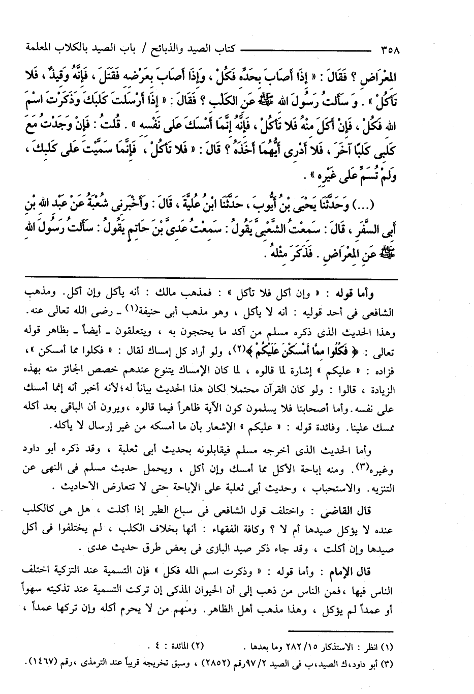 وأما الحديث الذى أخرجه مسلم فيقابلونه بحديث أبى ثعلبة، وقد ذكره أبو داود وغيره (¬3). ومنه إباحة الأكل مما أمسك وإن أكل، ويحمل حديث مسلم فى النهى عن التنزيه. والاستحباب، وحديث أبى ثعلبة على الإباحة حتى لا تتعارض الأحاديث.