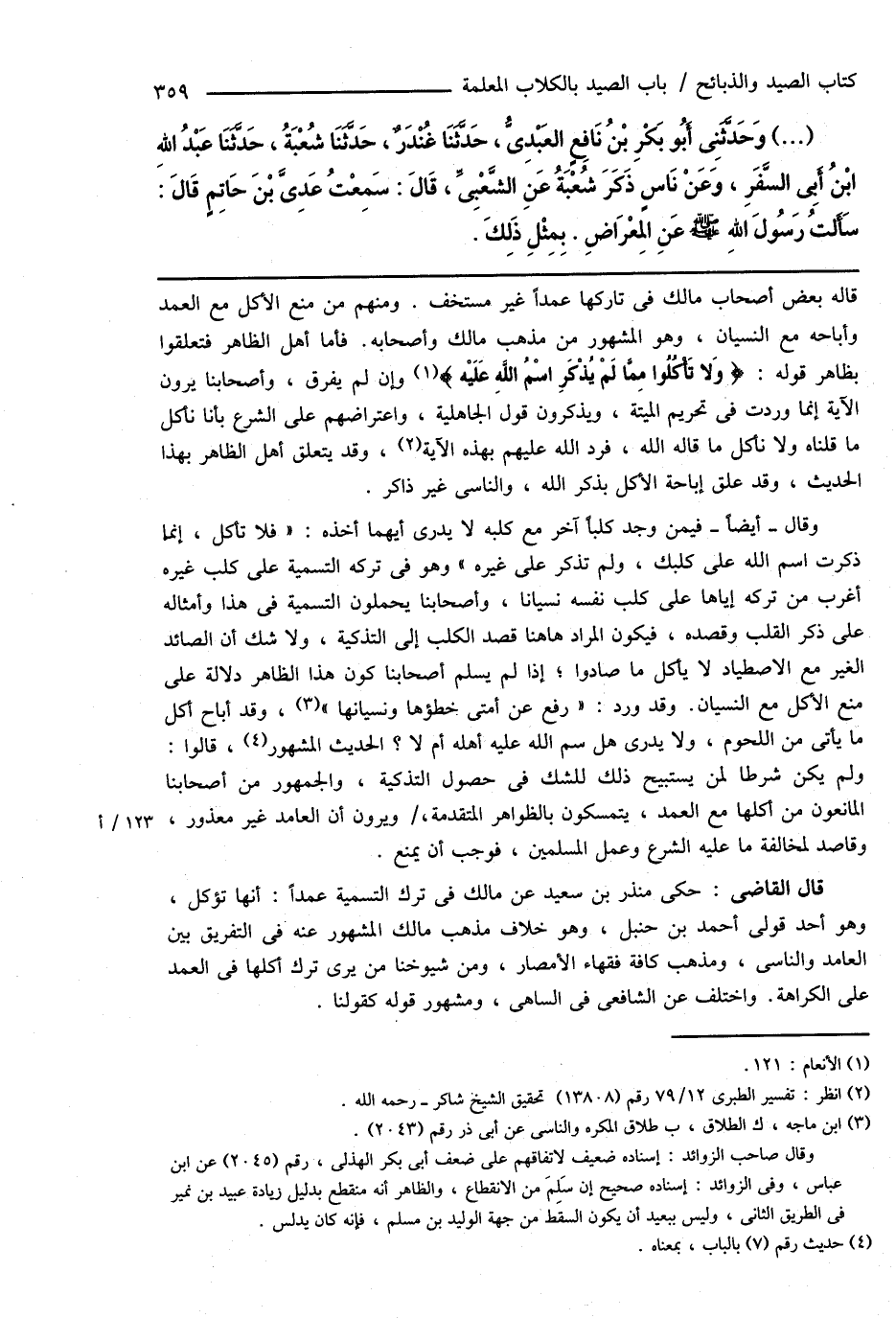 قال القاضى: حكى منذر بن سعيد عن مالك فى ترك التسمية عمداً: أنها تؤكل، وهو أحد قولى أحمد بن حنبل، وهو خلاف مذهب مالك المشهور عنه فى التفريق بين العامد والناسى، ومذهب كافة فقهاء الأمصار، ومن شيوخنا من يرى ترك أكلها فى العمد على الكراهة. واختلف عن الشافعى فى الساهى، ومشهور قوله كقولنا.