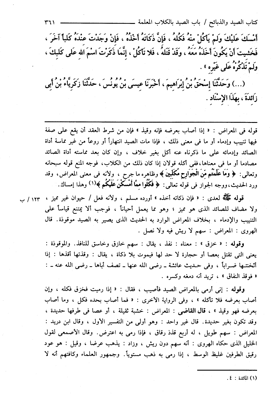 وقوله: إنى أرمى بالمعراض الصيد فأصيب، فقال: " إذا رميت فخزق فكله، وإن أصاب بعرضه فلا تأكله "، وفى الرواية الأخرى: " فما أصاب بحده فكل، وما أصاب بعرضه فهو وقيذ "، قال القاضى: المعراض: خشبة ثقيلة، أو عصا فى طرفها حديدة، وقد تكون بغير حديدة. قال غير واحد: وهو أولى من التفسير الأول، وقال ابن دريد: المعراض: سهم طويل، له أربع قذذ رقاق، فإذا رمى به اعترض. وقال الأصمعى لقول الخليل الذى حكاه الهروى: أنه سهم دون ريش، وزاد: يذهب عرضاً، وقيل: هو عود رقيق الطرفين غليظ الوسط، إذا رمى به ذهب مستوياً. وجمهور العلماء وكافتهم أنه لا
