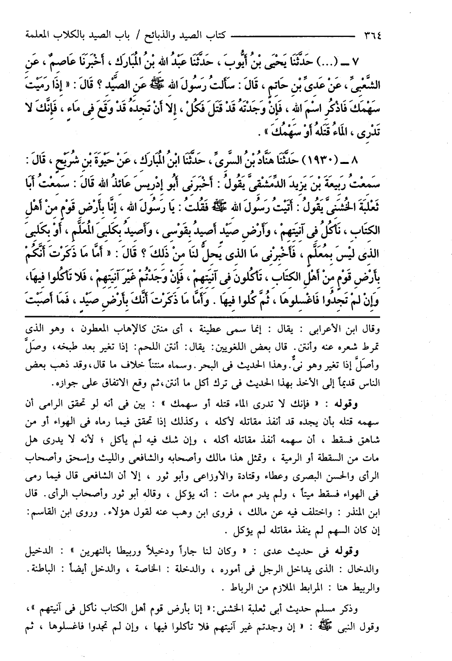 8 - (1930) حَدَّثَنَا هَنَّادُ بْنُ السَّرِىِّ، حَدَّثَنَا ابْنُ المُبَارَكِ، عَنْ حَيْوَةَ بْنِ شُرَيْحٍ، قَالَ: سَمِعْتُ رَبِيعَةَ بْنَ يَزِيدَ الدِّمَشْقِىَّ يَقُولُ: أَخْبَرَنِى أَبُو إِدْرِيسَ عَائِذُ اللهِ قَالَ: سَمِعْتُ أَبَا ثَعْلَبَةَ الخُشَنِىَّ يَقُولُ: أَتَيْتُ رَسُولَ اللهِ صَلَّى اللهُ عَلَيْهِ وَسَلَّمَ فَقُلْتُ: يَا رَسُولَ اللهِ، إِنَّا بِأَرْضِ قَوْمٍ مِنْ أَهْلِ الكِتَابِ، نَأكُلُ فِى آنِيَتِهِمْ، وَأَرْضِ صَيْدٍ أَصِيدُ بِقَوْسِى، وَأَصِيدُ بِكَلبِىَ المُعَلَّمِ، أَوْ بِكَلبِىَ الذَى لَيْسَ بِمُعَلَّمٍ، فَأَخْبِرْنِى مَا الَّذِى يَحِلُّ لنَا مِنْ ذَلِكَ؟ قَالَ: " أَمَّا مَا ذَكَرْتَ أَنَّكُمْ بِأَرْضِ قَوْمٍ مِنْ أَهْلِ الكِتَابِ، تَأكُلونَ فِى آنِيَتِهِمْ، فَإِنْ وَجَدْتُمْ غَيْرَ آنِيَتِهِمْ، فَلا تَأكُلوا فِيهَا، وَإِنْ لمْ تَجِدُوا فَاغْسِلوهَا، ثُمَّ كُلوا فِيهَا. وَأَمَّا مَا ذَكَرْتَ أَنَّكَ بِأَرْضِ صَيْدٍ، فَمَا أَصَبْتَ